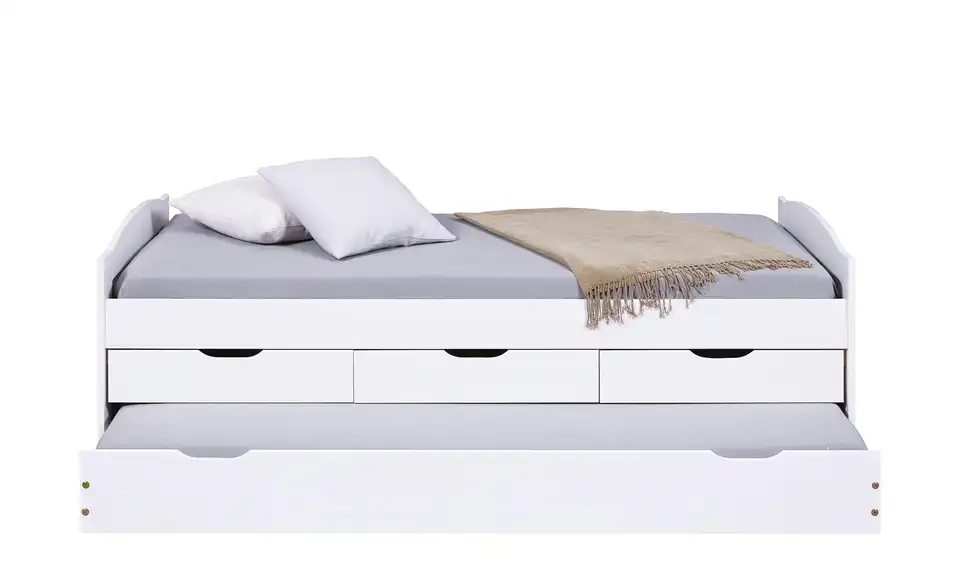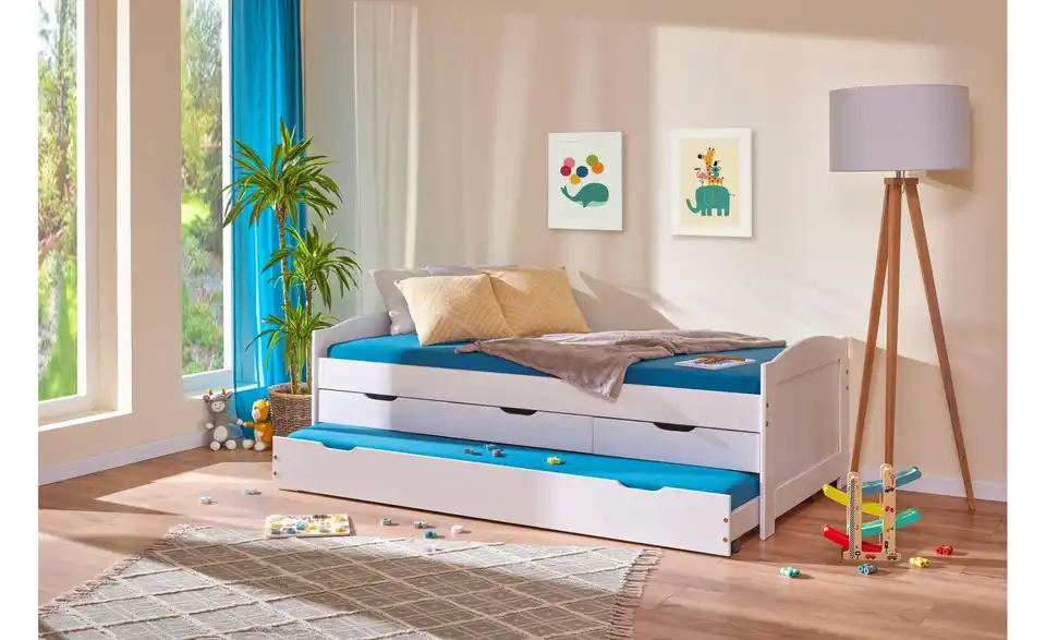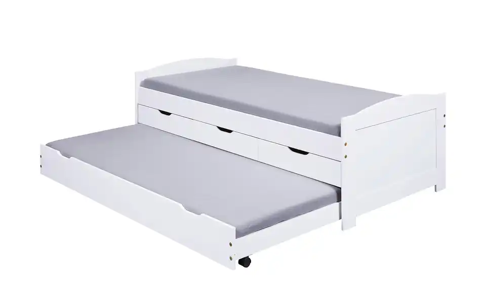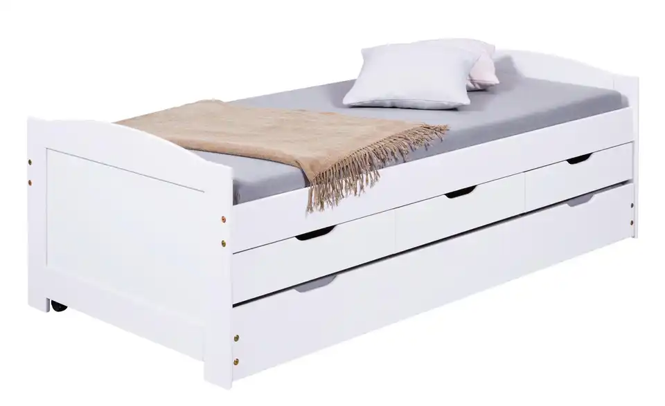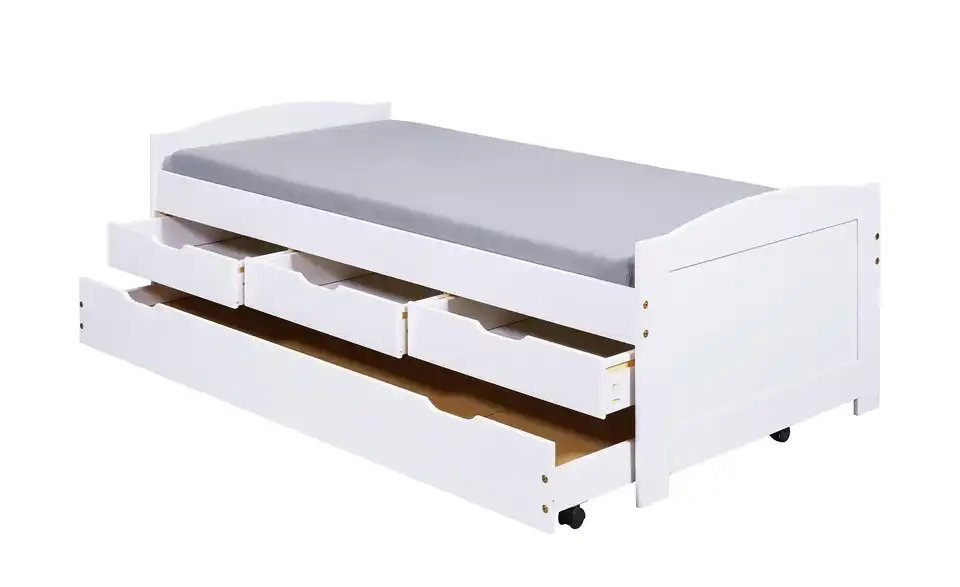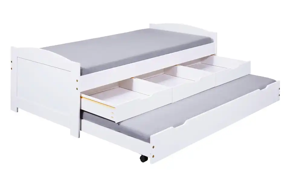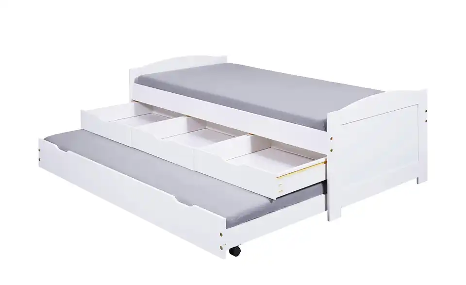Dieses Funktionsbett ist praktisch für das Kinder- und Jugendzimmer. Die Liegefläche ist erhöht, der Platz darunter wird für Stauraum und ein Ausziehbett genutzt. Bettgestell und Fronten bestehen aus massivem Kiefernholz und sind weiß lackiert.Lieferung & Versand