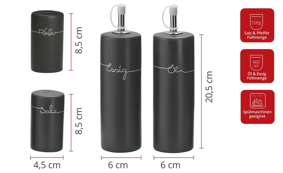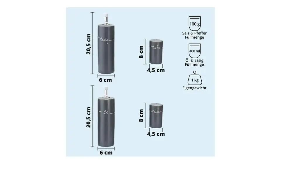 - Lieferumfang / mitgeliefertes Zubehör1 Menage, 1 Salzstreuer, 1 Pfefferstreuer, 1 Ölgießer und 1 Essiggießer