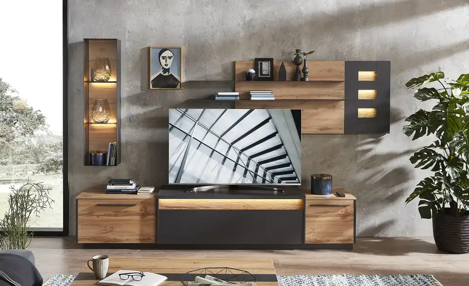 - nicht im Lieferumfang enthaltenDesignpaneelBeleuchtung (LED-Lichtleiste für Lowboard, 2x LED-Bodenbeleuchtung für Regal)Controller (für Beleuchtung notwendig)