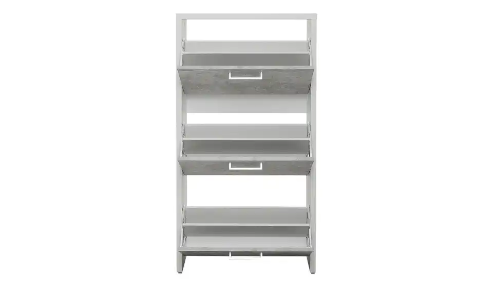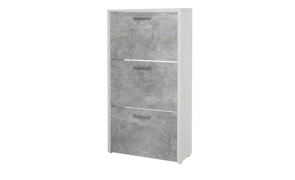 Etwa 18 Paar Schuhe passen in den Schuhschrank Friemar. Er ist mit drei Klappen und Schuhwalzen dahinter ausgestattet. Die Oberflächen sind beschichtet und deshalb unempfindlich. Friemar ist in Weiß und Betonoptik designt.Lieferung & Versand