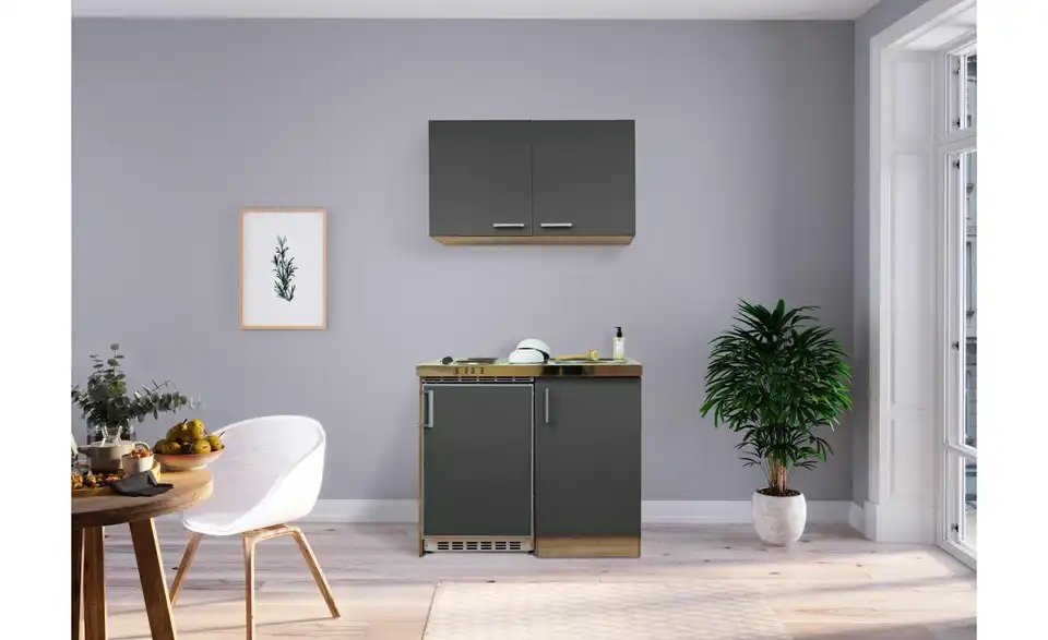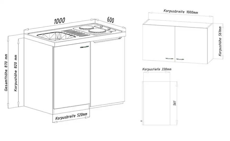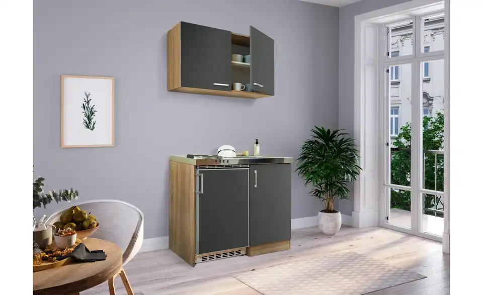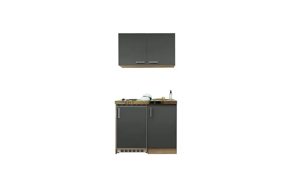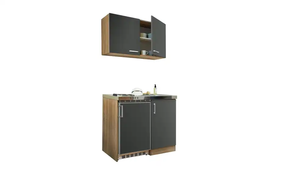 - Lieferumfang / mitgeliefertes ZubehörKüche inkl. Elektrogeräte (Unterbaukühlschrank, Pantryauflage mit Kochmulde)
