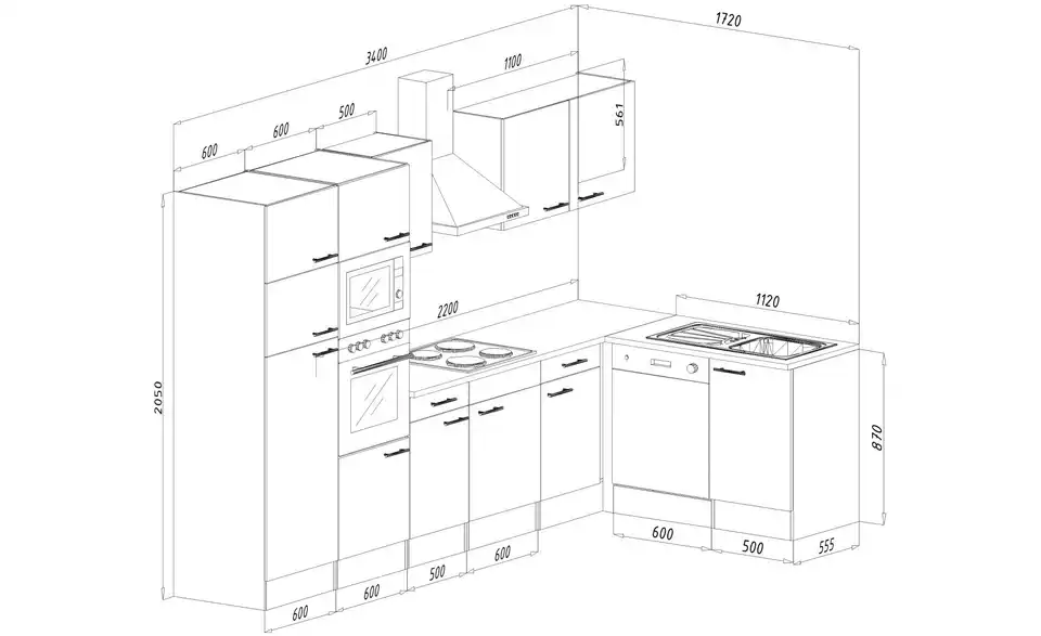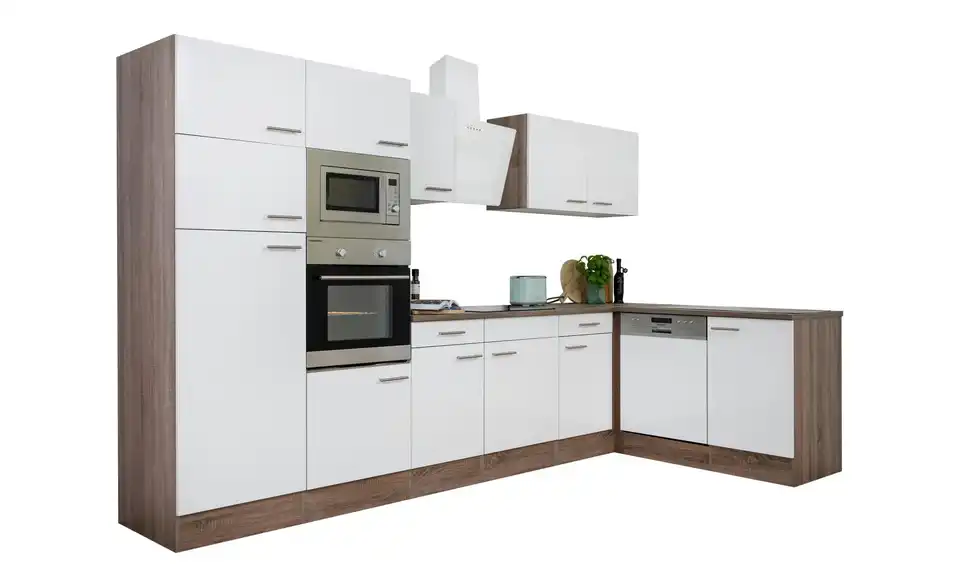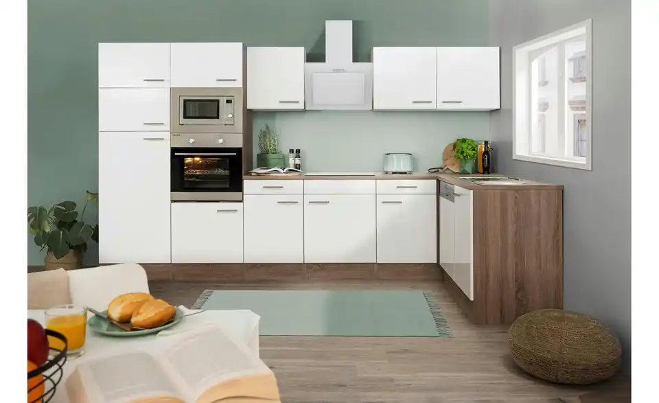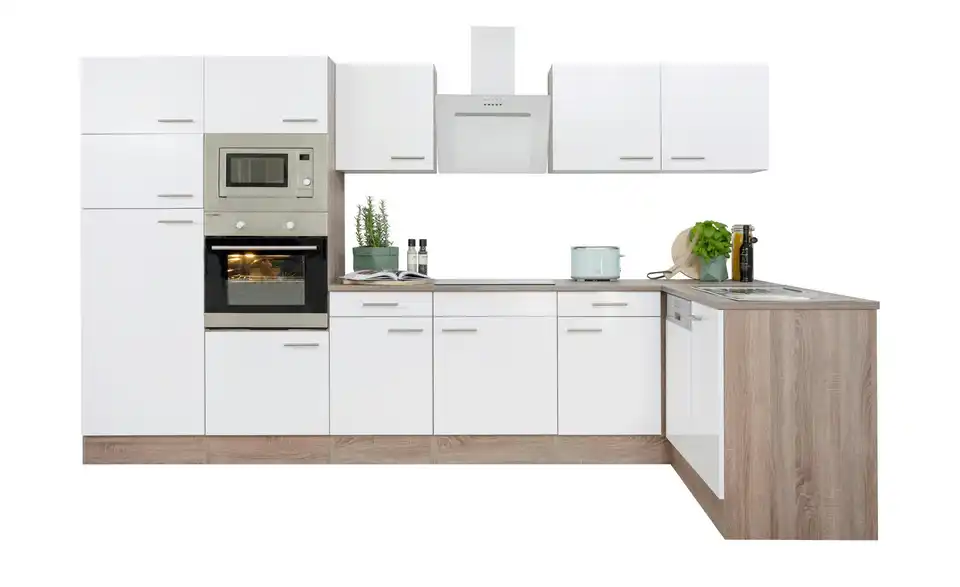- Lieferumfang / mitgeliefertes ZubehörKüche inkl. Elektrogeräte (Einbaubackofen, Glaskeramikkochfeld, Schräghaube, Einbau Kühl-/Gefrierkombination, Einbaumikrowelle, Einbaugeschirrspüler)