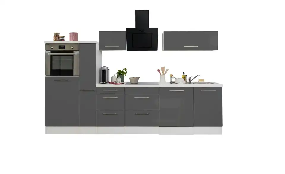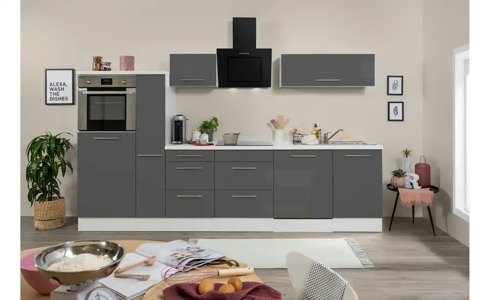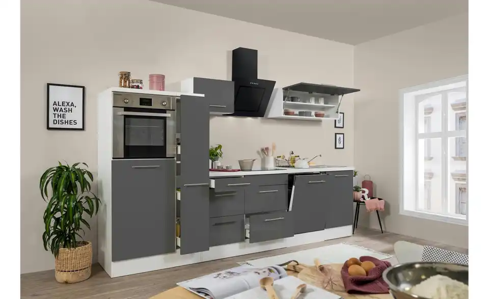 - Lieferumfang / mitgeliefertes ZubehörKüche inkl. Elektrogeräte (Einbaubackofen, Glaskeramikkochfeld, Schräghaube, Einbaukühlschrank, Einbaugeschirrspüler)