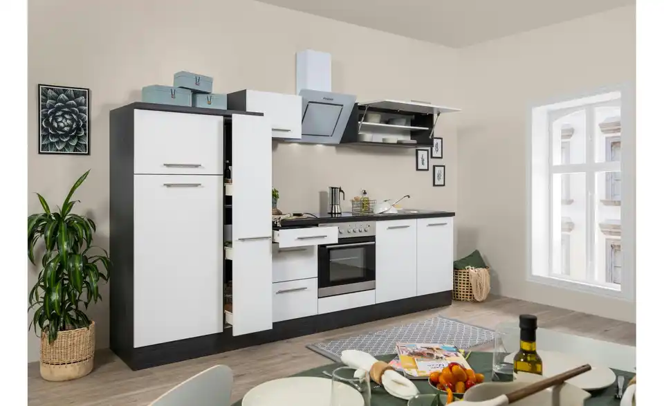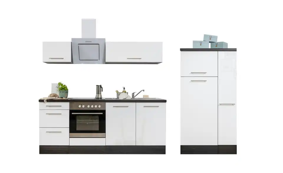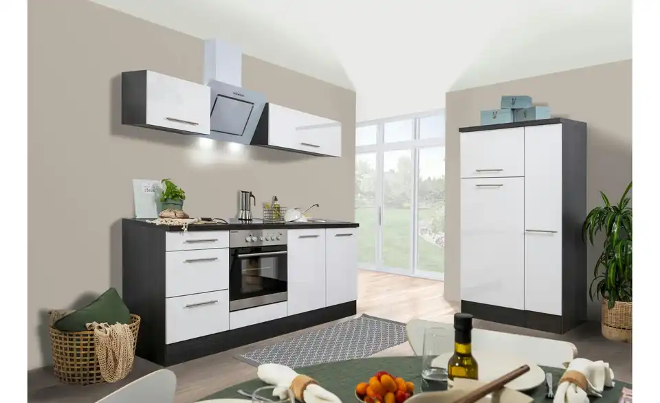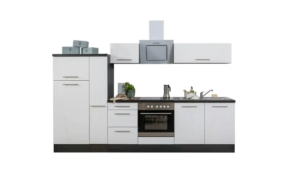 - Lieferumfang / mitgeliefertes ZubehörKüche inkl. Elektrogeräte (Einbau Herdset, Schräghaube, Einbau Kühl-/Gefrierkombination)