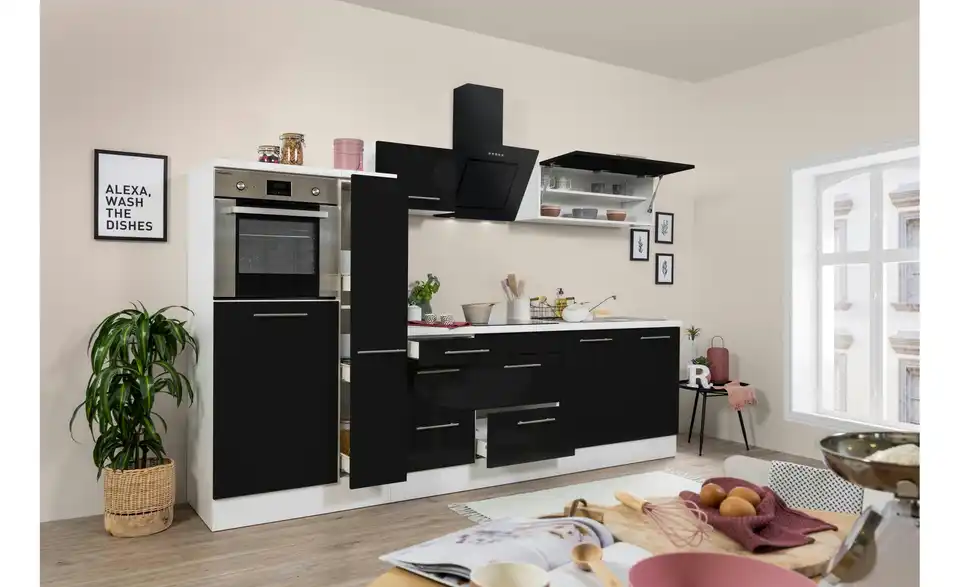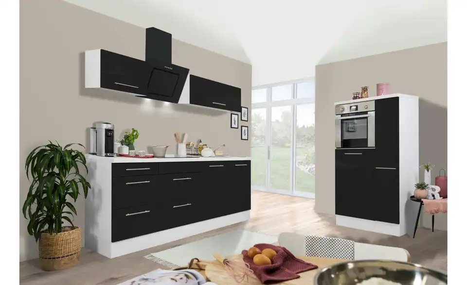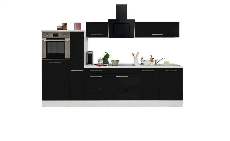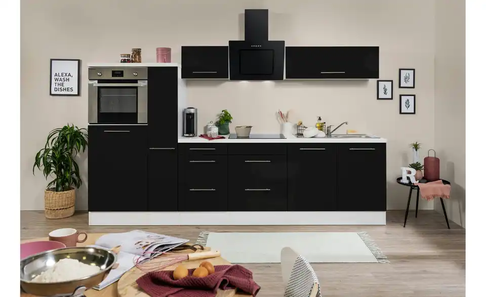 - Lieferumfang / mitgeliefertes ZubehörKüche inkl. Elektrogeräte (Einbaubackofen, Glaskeramikkochfeld, Schräghaube, Einbaukühlschrank)