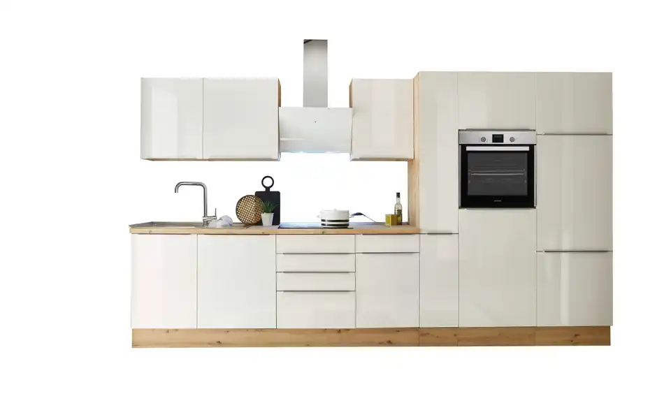 - Lieferumfang / mitgeliefertes ZubehörKüche inkl. Elektrogeräte (Einbaubackofen, Glaskeramikkochfeld, Schräghaube, Einbau Kühl-/Gefrierkombination, Einbaugeschirrspüler)