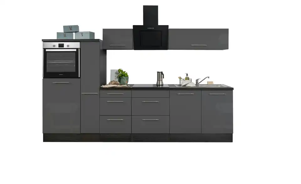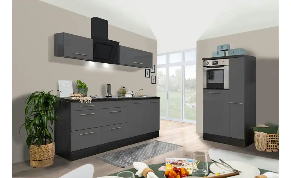 - Lieferumfang / mitgeliefertes ZubehörKüche inkl. Elektrogeräte (Einbaubackofen, Glaskeramikkochfeld, Schräghaube, Einbaukühlschrank)