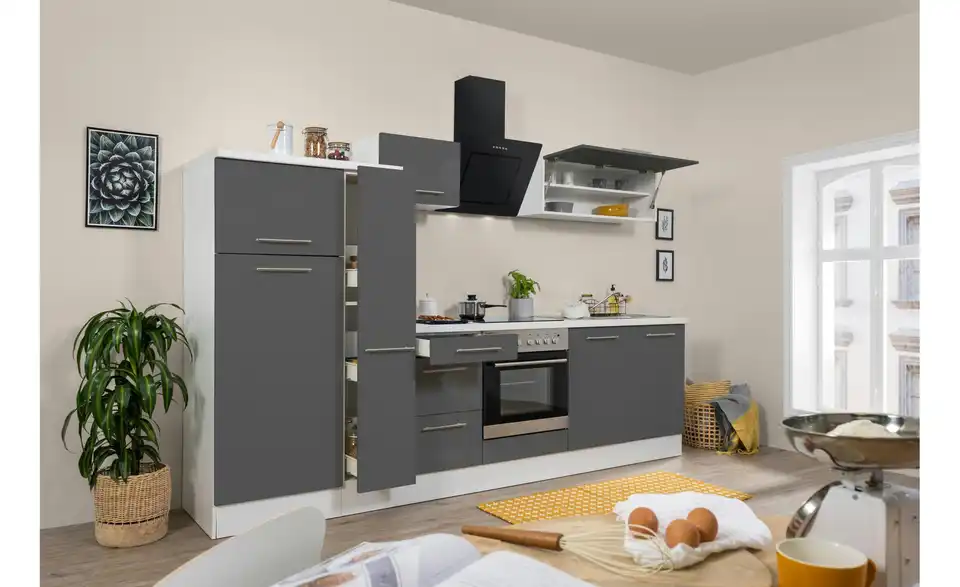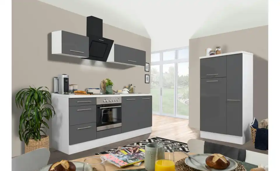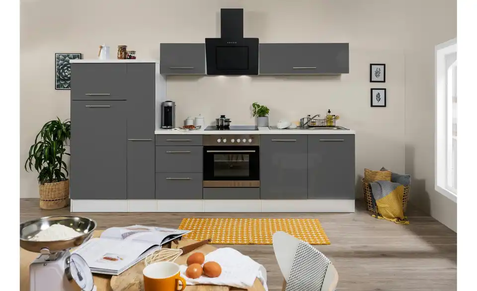 - Lieferumfang / mitgeliefertes ZubehörKüche inkl. Elektrogeräte (Einbau Herdset, Schräghaube, Einbau Kühl-/Gefrierkombination)