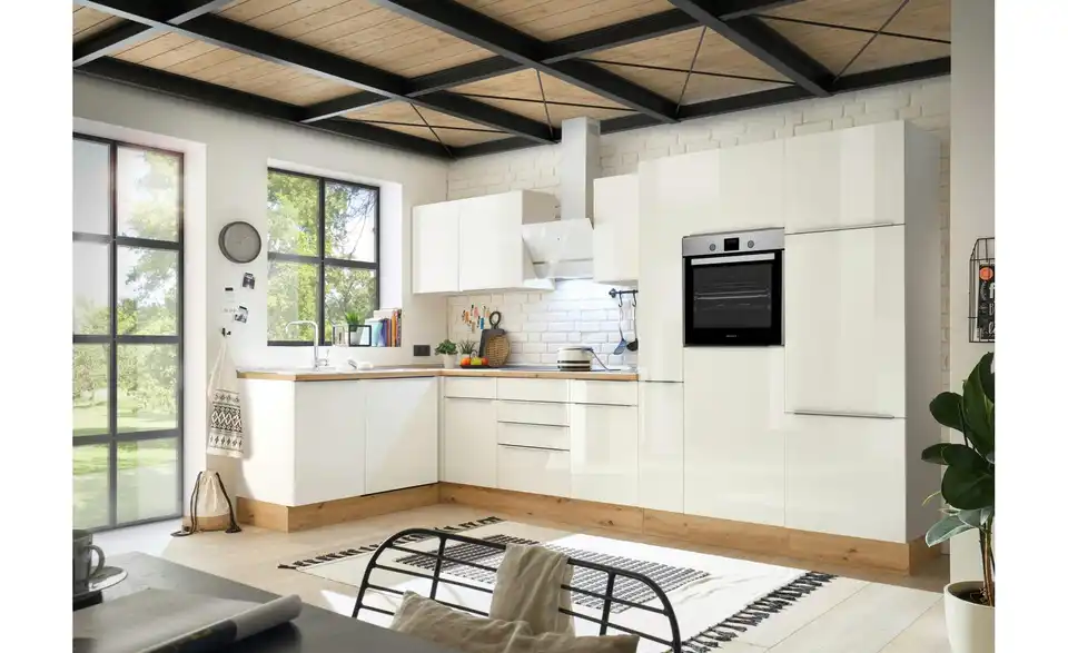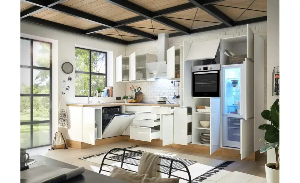 - Lieferumfang / mitgeliefertes ZubehörKüche inkl. Elektrogeräte (Einbaubackofen, Glaskeramikkochfeld, Schräghaube, Einbau Kühl-/Gefrierkombination, Einbaugeschirrspüler)