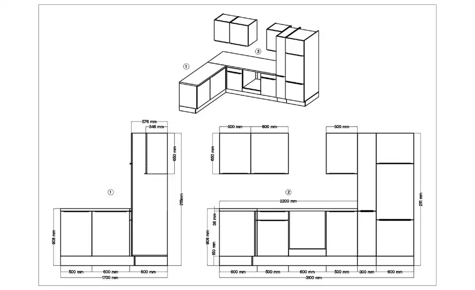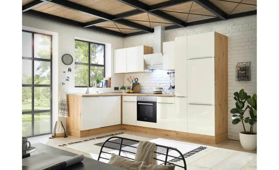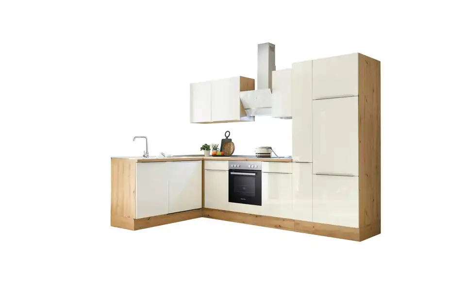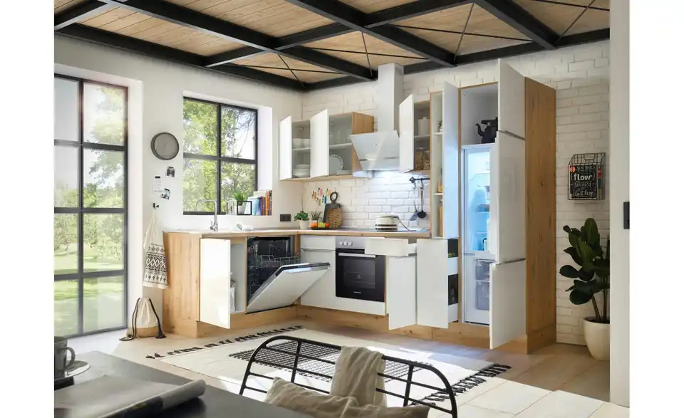 - Lieferumfang / mitgeliefertes ZubehörKüche inkl. Elektrogeräte (Einbau Herdset, Schräghaube, Einbau Kühl-/Gefrierkombination, Einbaugeschirrspüler)