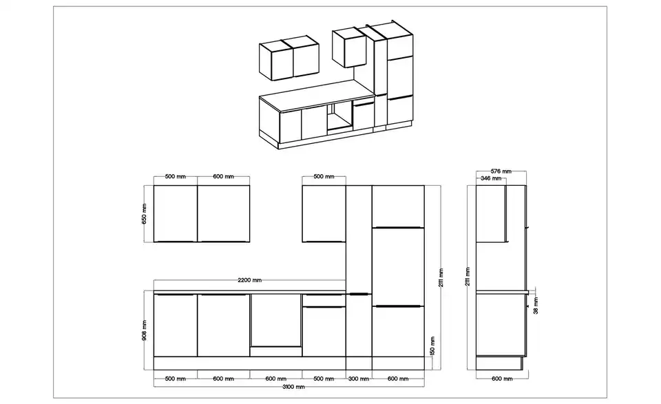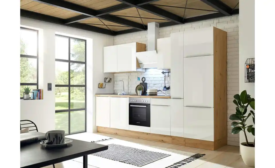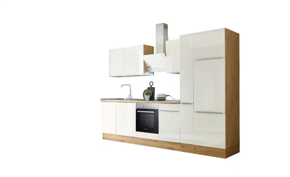 - Lieferumfang / mitgeliefertes ZubehörKüche inkl. Elektrogeräte (Einbau Herdset, Schräghaube, Einbau Kühl-/Gefrierkombination, Einbaugeschirrspüler)