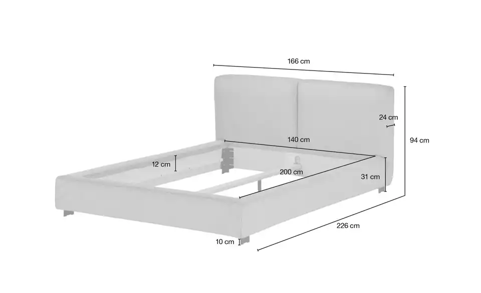 - Mehr zu MaßenEinlegetiefe Lattenrost max. 12,0 cmTiefe des Kopfteils ca. 24cm