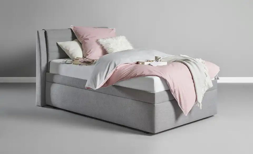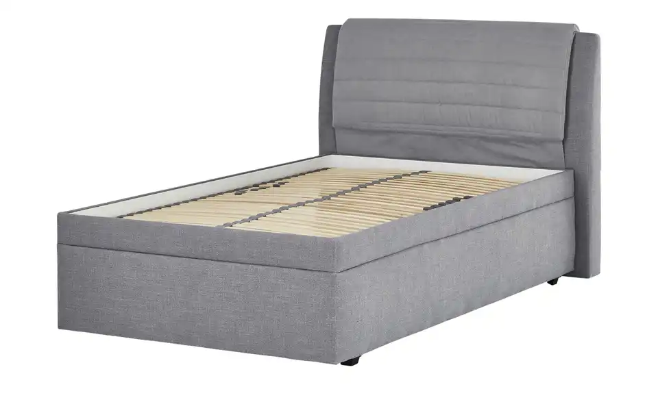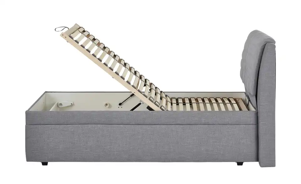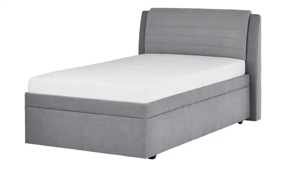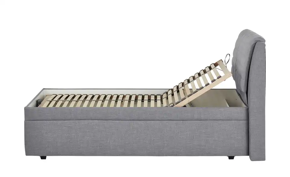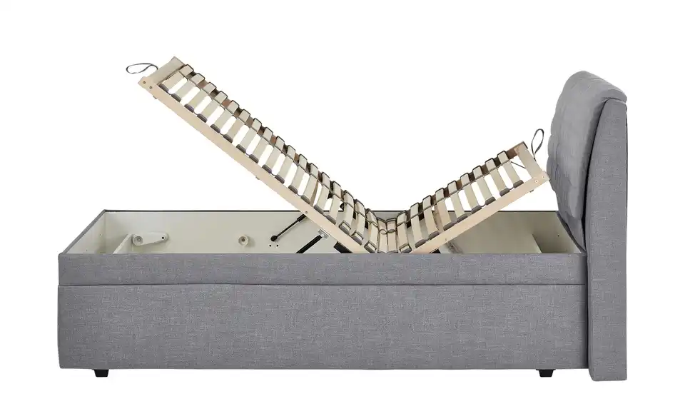 Dieses Bettgestell ist gepolstert und mit grauem Stoff bezogen. Das hohe Kopfteil ist super zum Anlehnen. Unterhalb der Liegefläche befindet sich ein Bettkasten. Ein passender Lattenrost ist im Lieferumfang enthalten. Er hat verstellbare Kopf- und Fußenden.Lieferung & Versand