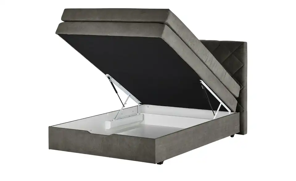 Das Boxspringbett Atika besticht durch sein weich gepolstertes Kopfteil in Karo-Steppung. Die zwei Matratzen mit flächenelastischen Bonnellfederkernen sorgen für höchsten Komfort. Ein mitgelieferter Schaumstofftopper rundet das Schlaf-Erlebnis gekonnt ab. Das Boxspringbett besitzt mit seinen 67 Zentimetern Bettseitenhöhe eine angenehme Komforthöhe. So kommen Sie am Morgen auch wieder problemlos aus dem Bett. Das moderne Bett ist nicht nur komfortabel, sondern auch funktional. Unterhalb der Liegefläche finden Sie einen geräumigen Bettkasten, der sich ganz einfach am Fußende des Bettes aufklappen lässt.Lieferung & Versand