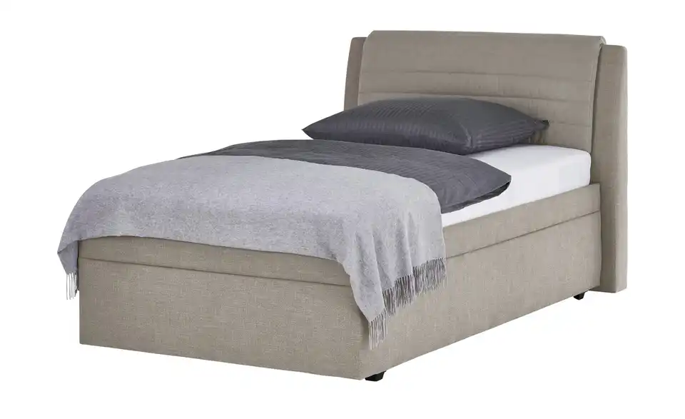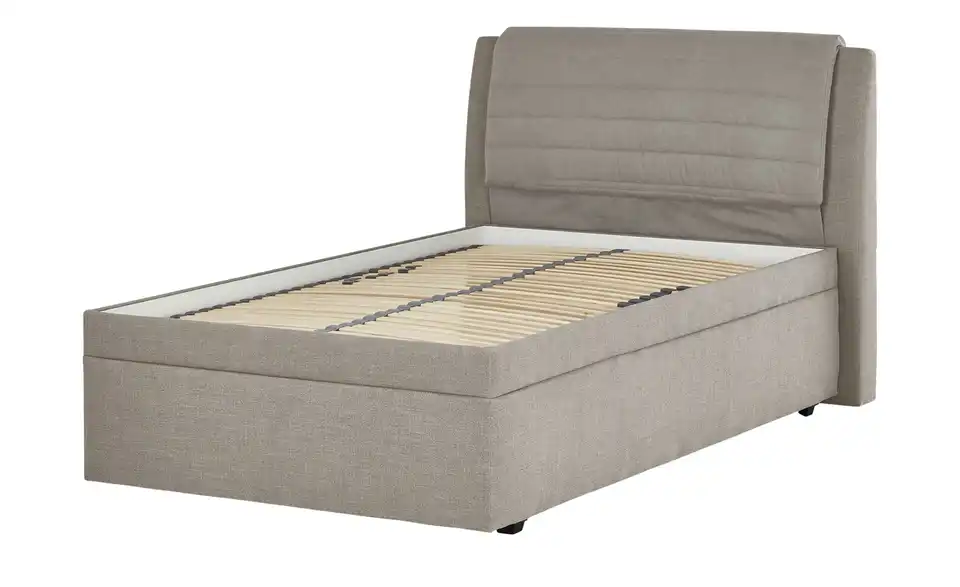 Dieses Bettgestell ist gepolstert und mit grauem Stoff bezogen. Das hohe Kopfteil ist super zum Anlehnen. Unterhalb der Liegefläche befindet sich ein Bettkasten. Ein passender Lattenrost ist im Lieferumfang enthalten. Er hat verstellbare Kopf- und Fußenden.Lieferung & Versand