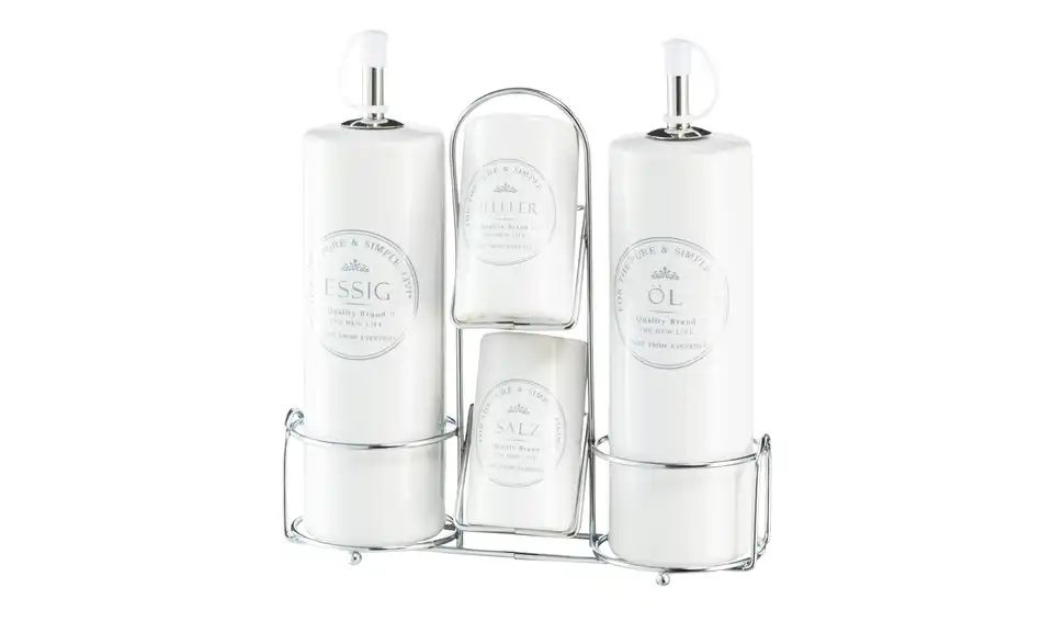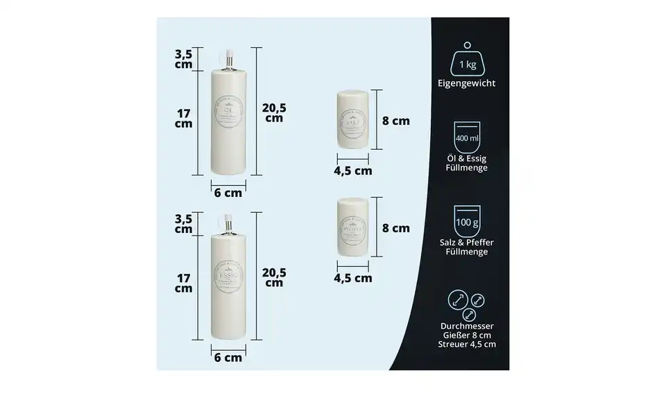 - Lieferumfang / mitgeliefertes Zubehörje 1 Öl- und Essiggiesser,je 1 Salz- und Pfefferstreuer1 Menage aus Edelstahl
