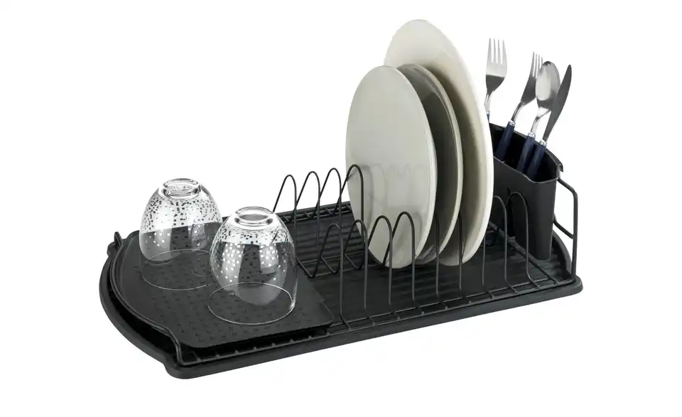 Ein hochwertiger und praktischer Küchenhelfer ist der Geschirrabtropfer Basic von Wenko. Das Abtropfgestell in Schwarz bietet Platz für Geschirr, Gläser und Besteck, die nach dem Spülen einfach trocknen können. Dank seiner kompakten Form ist er auch für kleinere Küchen geeignet. Der Abtropfständer ist mit einer Abtropfschale ausgestattet, die abnehmbar ist, sich leicht reinigen lässt und außerdem für eine trockene Arbeitsfläche sorgt. Die Abtropfmatte lässt sich zudem auch separat verwenden. Ausgestattet mit einem Tellerhalter, einem abnehmbaren Besteckkorb und viel Platz für Schüsseln und Gläser ist der Ständer der ideale Helfer beim Spülen. Er besteht aus einem hochwertigen Gestell aus pulverbeschichtetem Metall und schwarzen Kunststoffteilen, das macht ihn langlebig und robust. Neben den praktischen Funktionen ist der Abtropfer in Schwarz ein edler Blickfang in der Küche und passt perfekt in einen modernen Einrichtungsstil.Lieferung & Versand