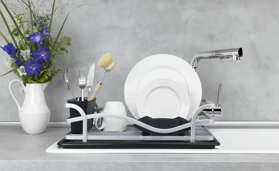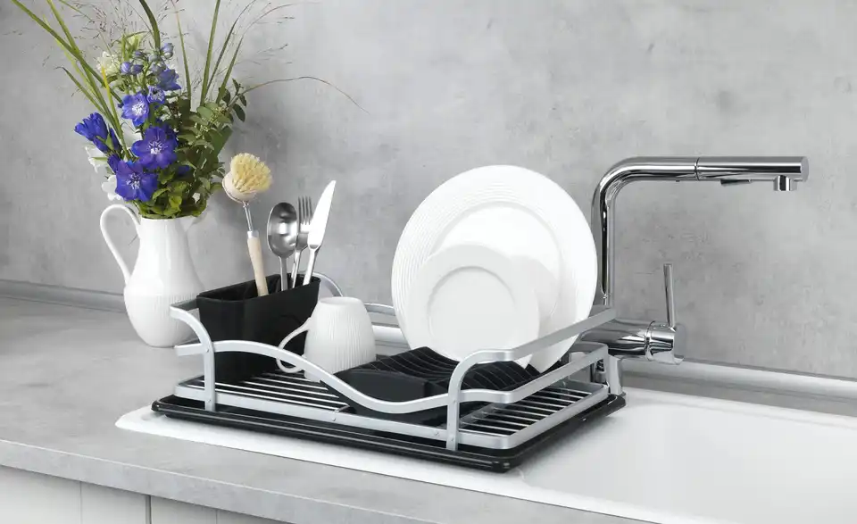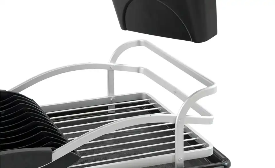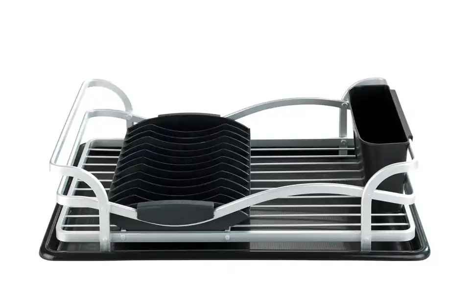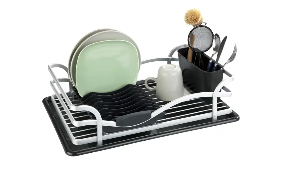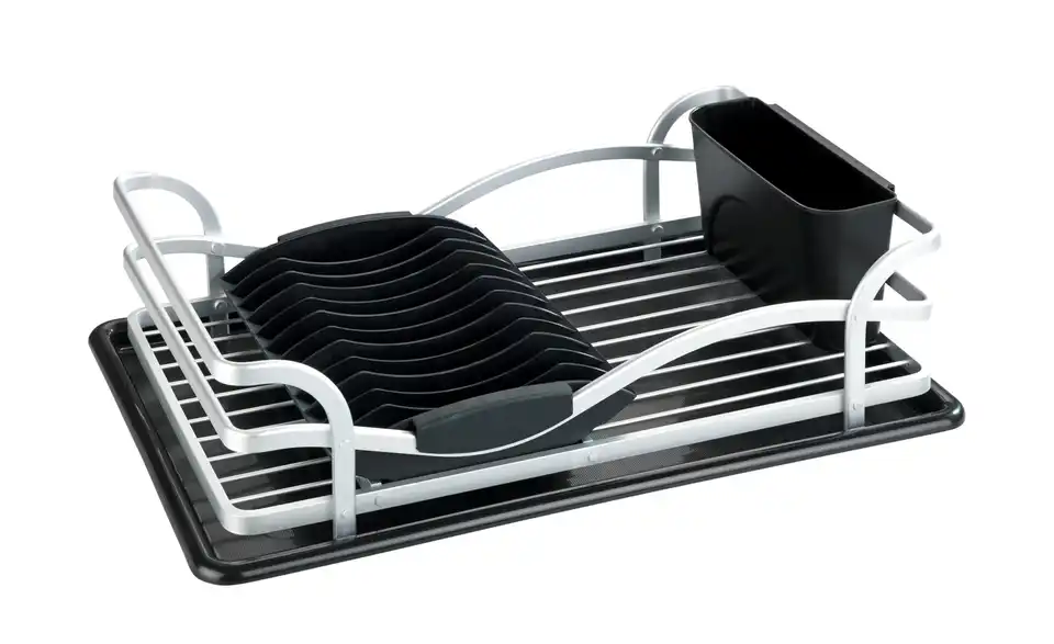 Ein hochwertiger und praktischer Küchenhelfer ist der Geschirrabtropfer aus Aluminium. Das Abtropfgestell in schwarz-silberner Optik bietet ausreichend Platz für Geschirr, Gläser und Besteck, die nach dem Spülen einfach trocknen können. Der Abtropfständer ist mit einer Abtropfschale ausgestattet, die abnehmbar ist, sich leicht reinigen lässt und außerdem für eine trockene Arbeitsfläche sorgt. Die Abtropfmatte lässt sich zudem auch separat verwenden. Ausgestattet mit einem Tellerhalter, einem abnehmbaren Besteckkorb und viel Platz für Schüsseln und Gläser ist der Ständer der ideale Helfer beim Spülen. Er besteht aus einem hochwertigen Gestell aus rostfreiem, stabilen Aluminium und schwarzen Kunststoffteilen, das macht ihn langlebig und robust. Neben den praktischen Funktionen ist der Abtropfer ein edler Blickfang in der Küche und passt perfekt in einen modernen Einrichtungsstil.Lieferung & Versand