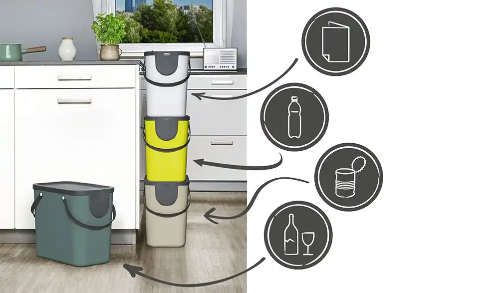 Das Müllsystem mit Deckel bietet Ihnen die Möglichkeit, den Abfall im Haushalt ganz einfach zu trennen. Die verschiedenen Eimer aus Kunststoff lassen sich problemlos aufeinander stapeln, sodass sie auch in Räumen mit wenig Platz perfekt eingesetzt werden können. Und bei Nichtbenutzung stapeln Sie die verschiedenen Eimer einfach ineinander. Durch die Griffe können Sie die Abfalleimer auch bequem transportieren. Beim Recycling Müllsystem ALBULA lässt sich auf einen Blick erkennen, welche Abfallprodukte in welchen Eimer gehören. Dafür wird an der Vorderseite des Deckels ein Aufkleber angebracht, der anzeigt, ob PET-Flaschen, Glasflaschen oder Papier in den Abfalleimer gehören.Lieferung & Versand