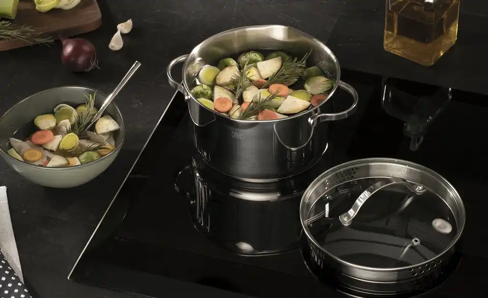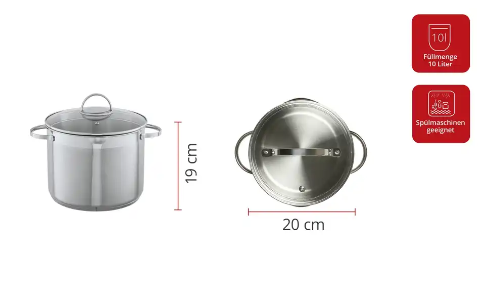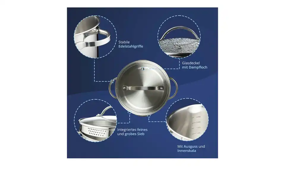 - Lieferumfang / mitgeliefertes Zubehör1 Edelstahltopf Ø24xH20cm2 Siebeinsätze