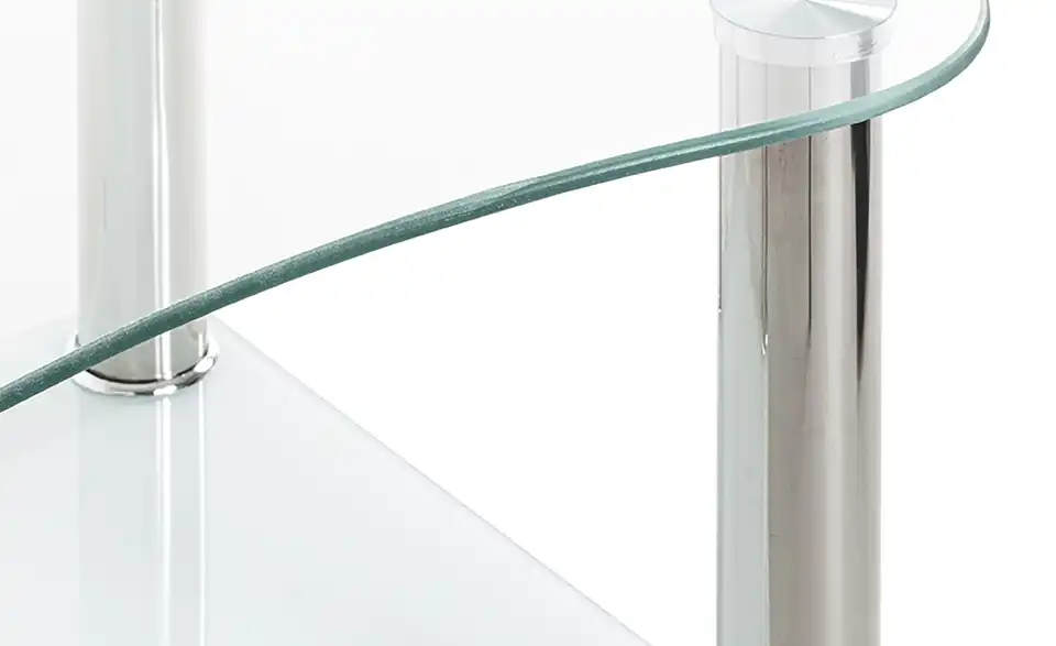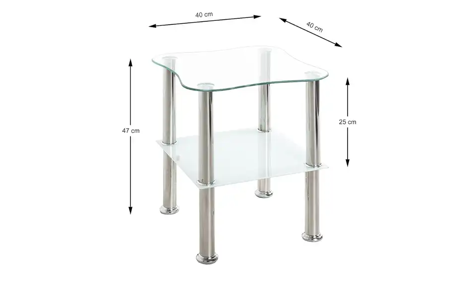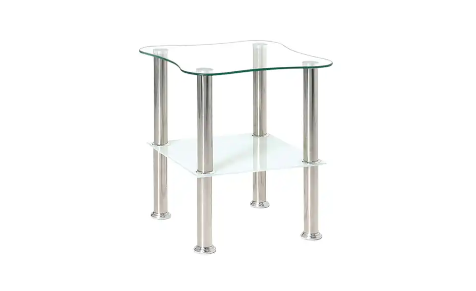 Der Beistelltisch bietet Stellfläche auf Tischplatte und Ablage. Während die Tischplatte farblos ist, setzt sich die Ablage in Weiß ab. Beide sind aus Glas. Das Edelstahlgestell fällt durch seinen Metall-Look auf.Lieferung & Versand
