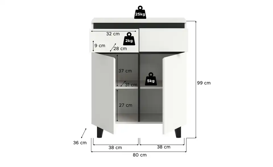 - max. Belastbarkeit je Schubkasten bis ca.2 kg