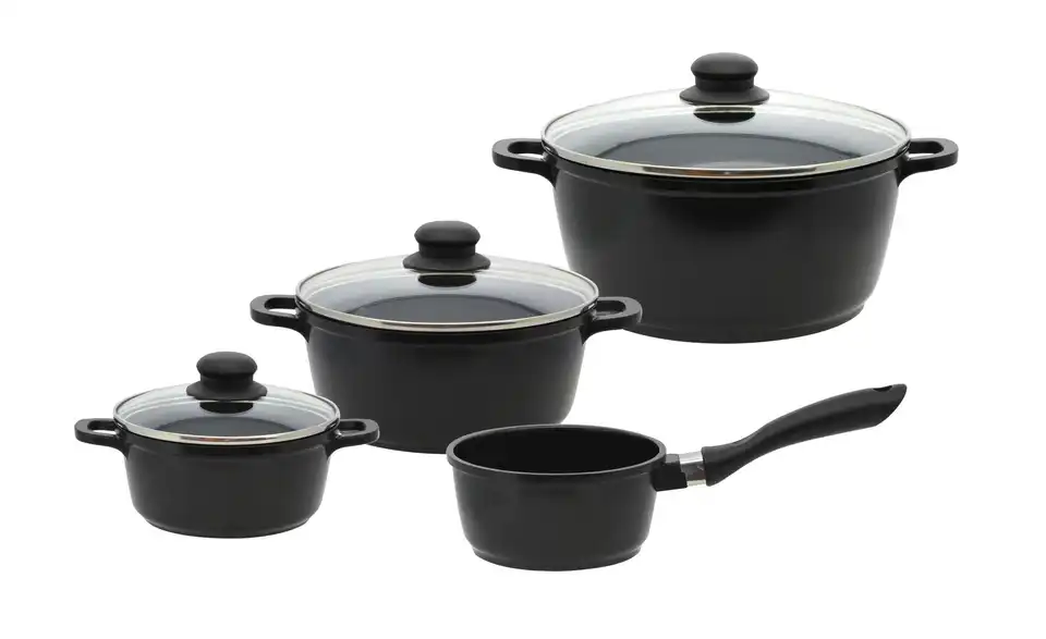 - Lieferumfang / mitgeliefertes Zubehör1 x Kochtopf m. D. 16 cm, Höhe 7,5 cm 1 x Kochtopf m. D. 20 cm, Höhe 9,0 cm 1 x Kochtopf m. D. 24 cm, Höhe 11,5 cm 1 x Stielkasserolle ohne Deckel 16 cm, Höhe 8 cm
