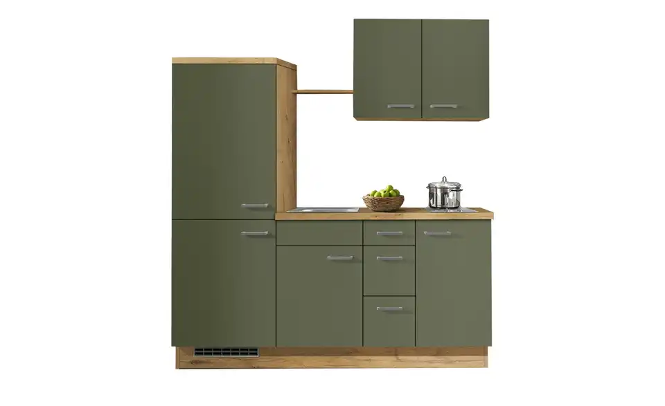 - Bestehend ausHighboard für Kühlgerät, Nische 88 cm B/H/T 60x162x56 cmSpülen-Unterschrank, 1 Tür B/H/T 50x72,3x56 cmUnterschrank, 1 Schublade, 2 Auszüge B/H/T 30x72,3x56 cmUnterschrank für KochmuldeB/H/T 45x72,3x56 cmRegalboden 45 cm langHängeschrank, 2 Türen B/H/T 80x58x32,6 cmArbeitsplatte 125 cm langAbdeckboden für Highboardschrank B/T 60x60 cmSockelleisteKühlschrank B/H/T ca. 54x87,5x54,5 cmKochplatte B/T ca. 29x51 cm