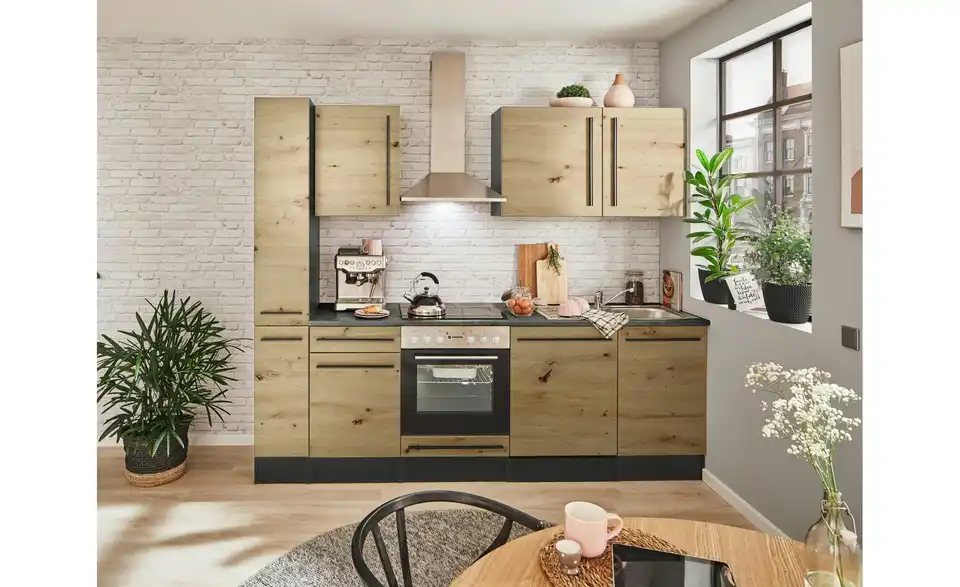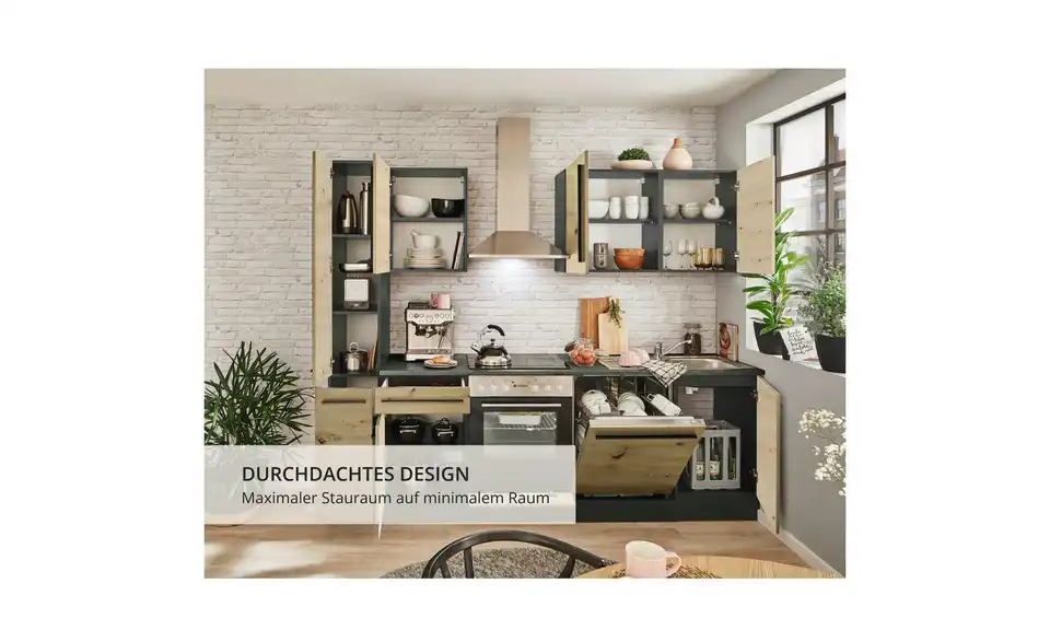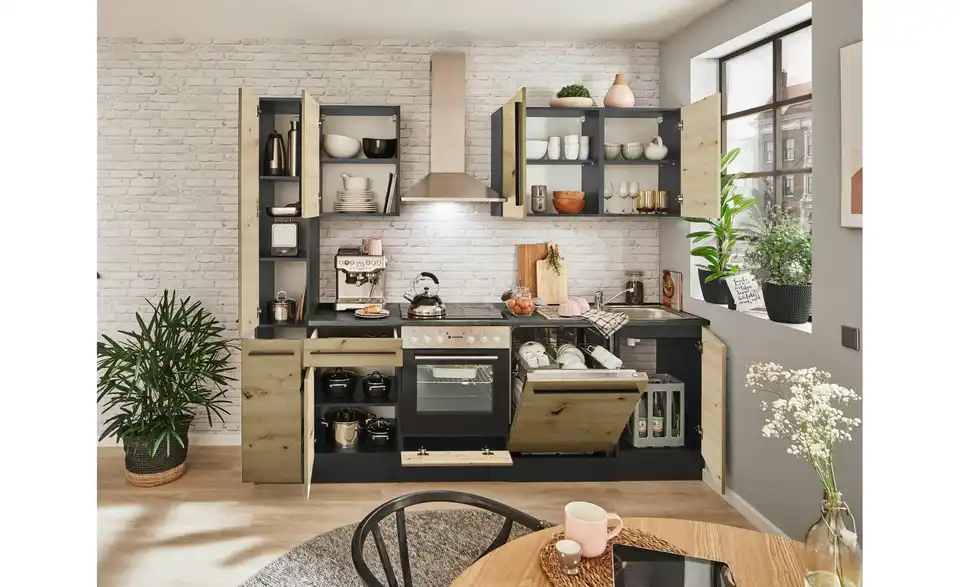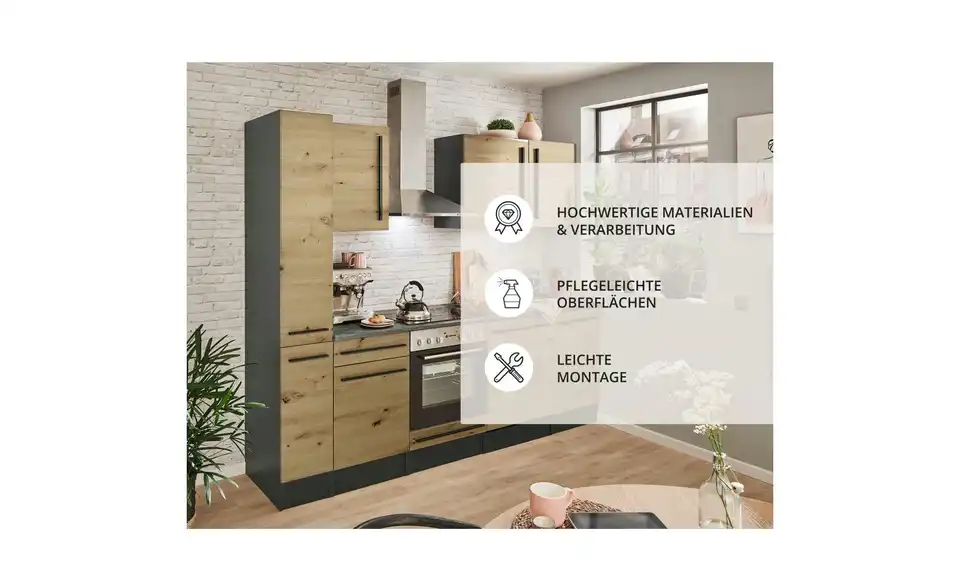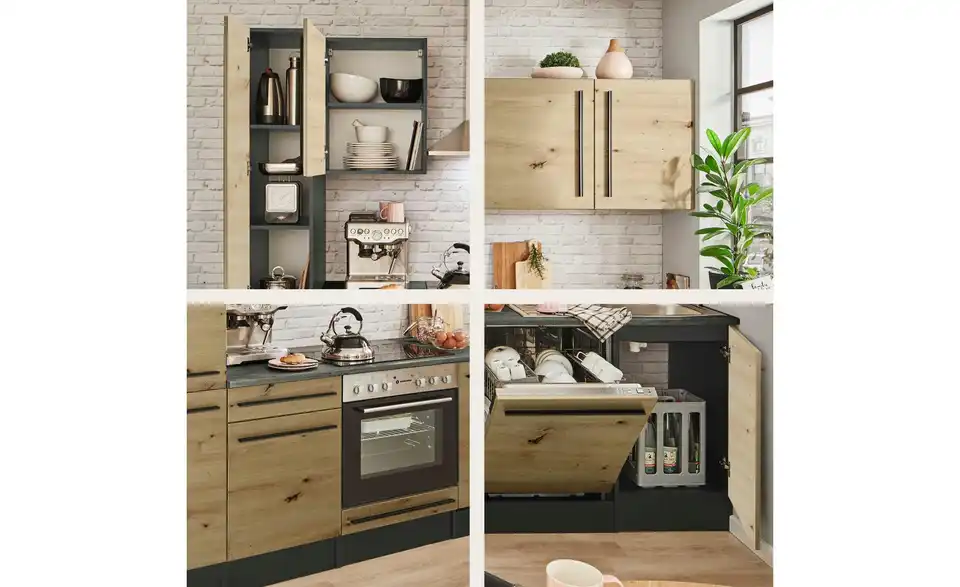 - Lieferumfang / mitgeliefertes ZubehörUnterschrank, Herdschrank, Tür für Geschirrspülerblende, Spülenunterschrank,Vorratsschrank, 3 Hängeschränke, 1 Arbeitsplatte, Spüle, Dunstabzugshaube, Einbauherdset, Geschirrspüler