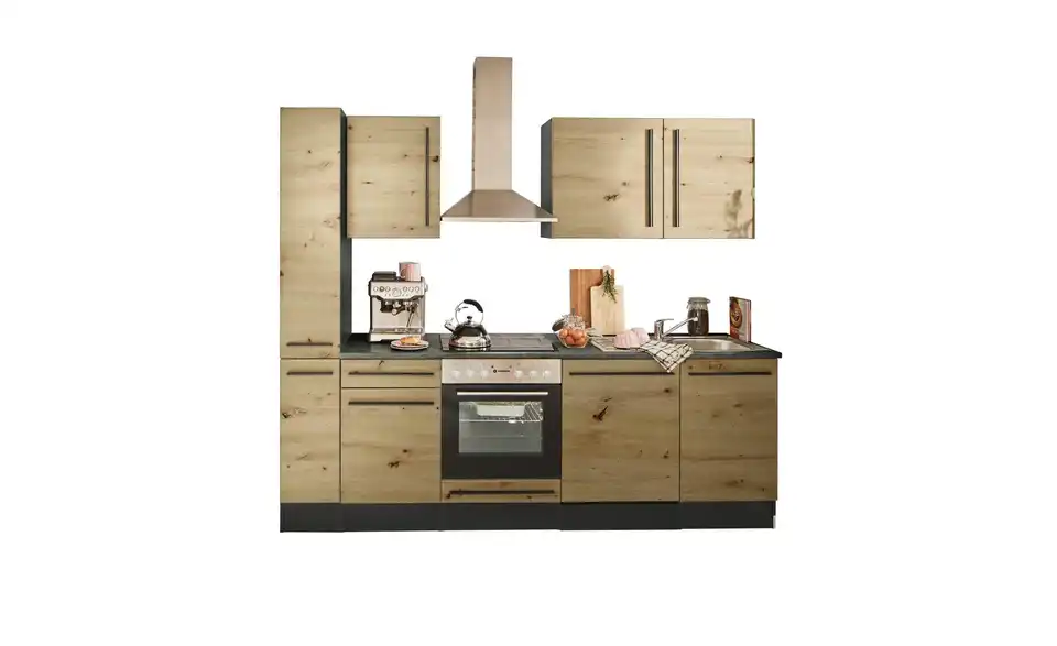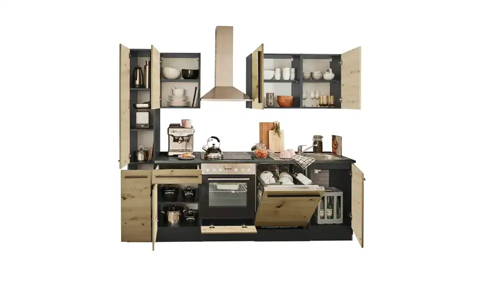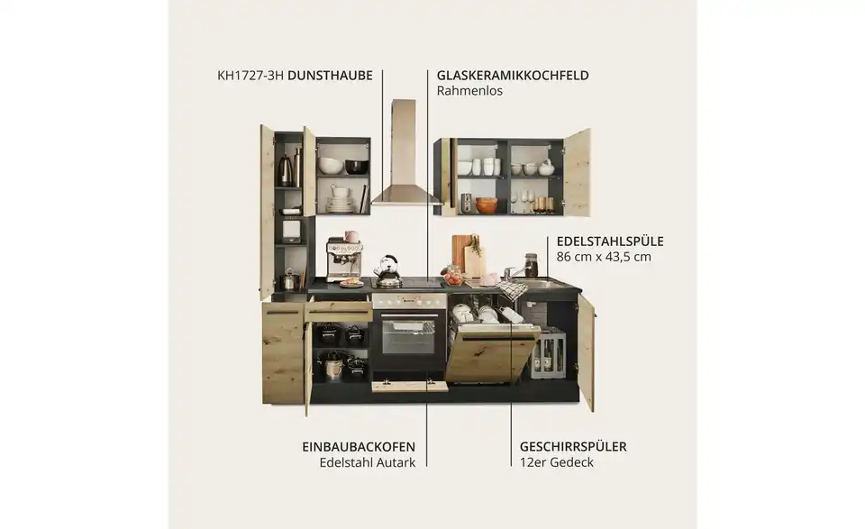 - Bestehend ausUnterschrank, Herdschrank, Tür für Geschirrspülerblende, Spülenunterschrank,Vorratsschrank, 3 Hängeschränke, 1 Arbeitsplatte, Spüle, Dunstabzugshaube, Einbauherdset, Geschirrspüler