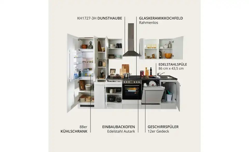 - Bestehend ausUnterschrank, Herdschrank, Tür für Geschirrspülerblende, Spülenunterschrank,Kühlumbauschrank,Vorratsschrank, 3 Hängeschränke, 1 Arbeitsplatte, Spüle, Dunstabzugshaube, Einbauherdset, Geschirrspüler, Einbaukühlschrank