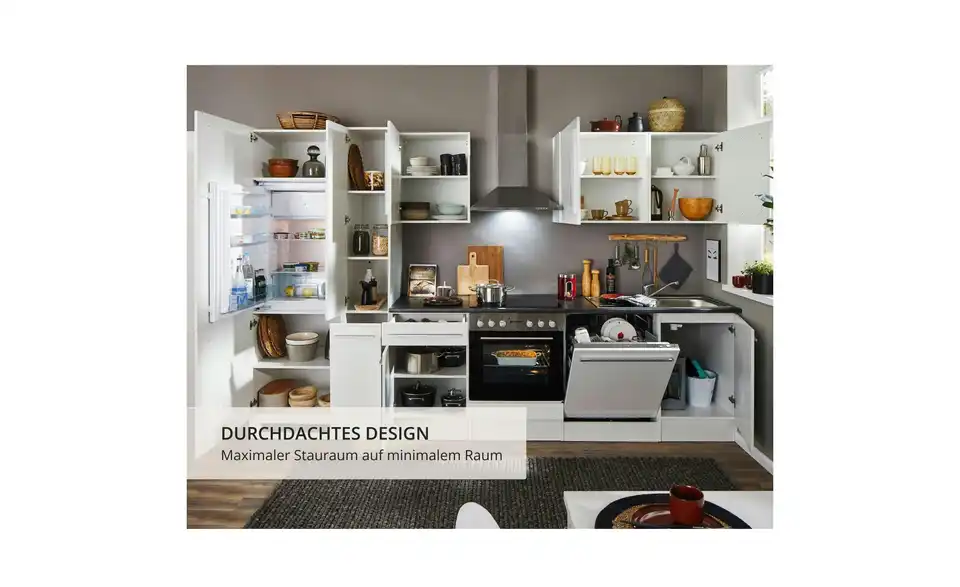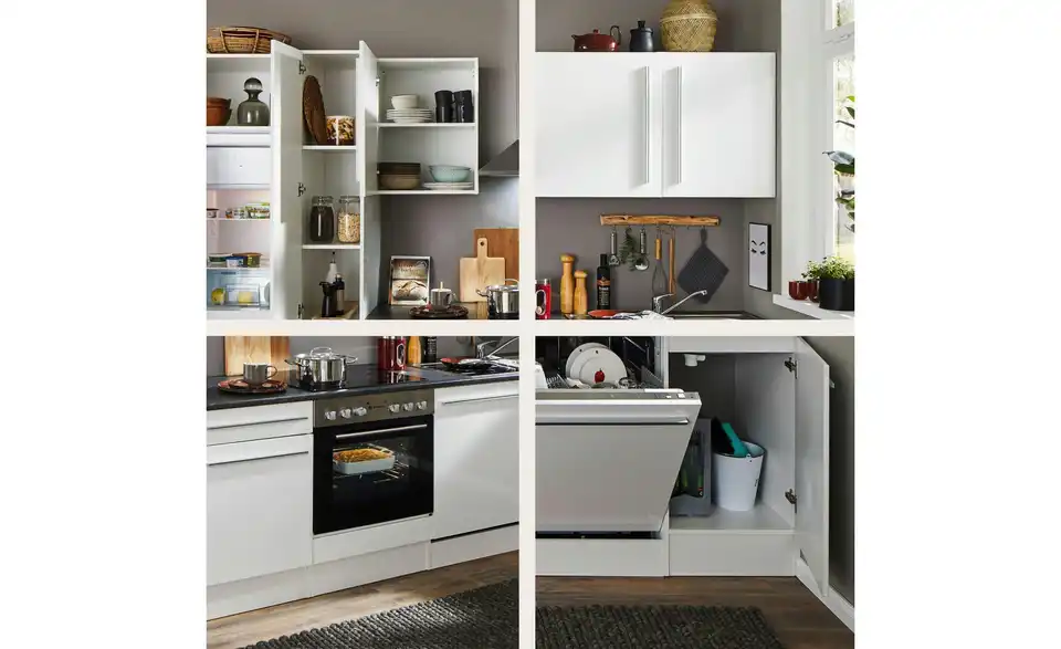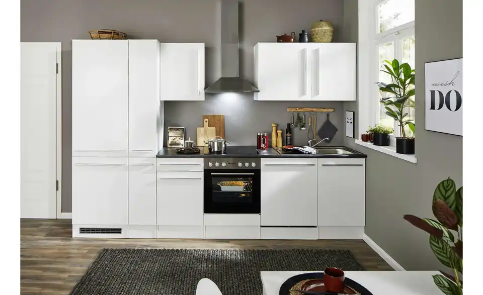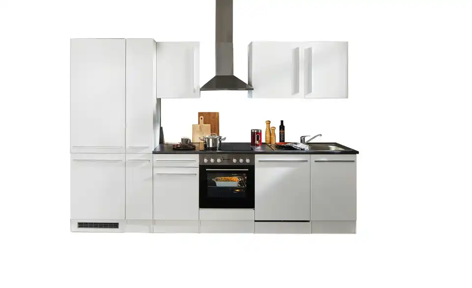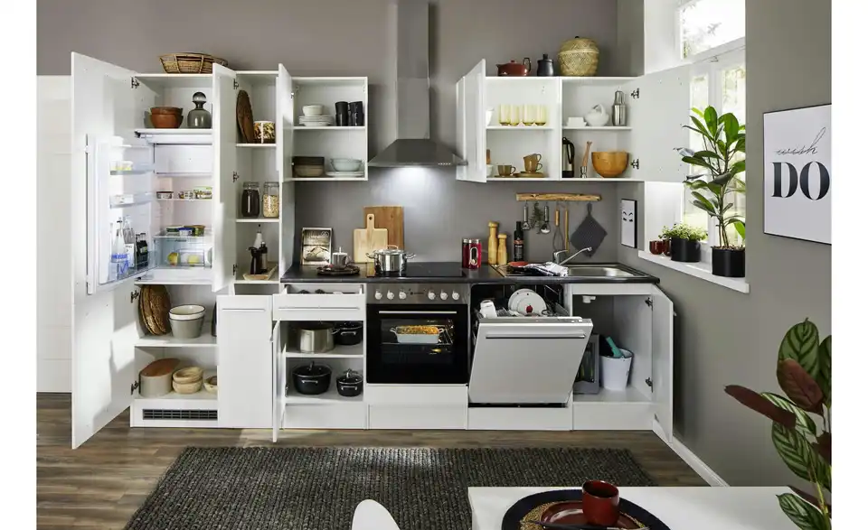 - Lieferumfang / mitgeliefertes ZubehörUnterschrank, Herdschrank, Tür für Geschirrspülerblende, Spülenunterschrank,Kühlumbauschrank,Vorratsschrank, 3 Hängeschränke, 1 Arbeitsplatte, Spüle, Dunstabzugshaube, Einbauherdset, Geschirrspüler, Einbaukühlschrank