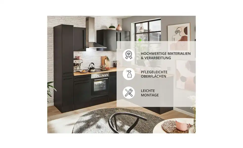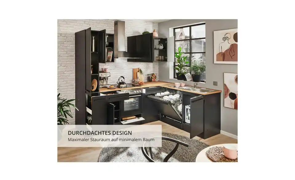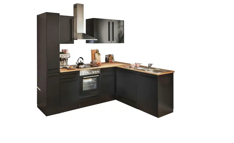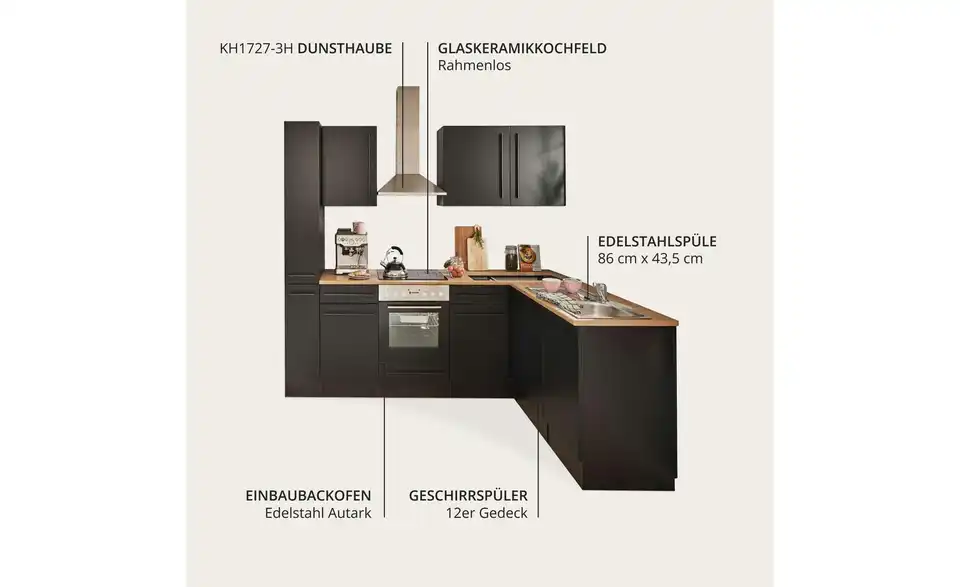- Lieferumfang / mitgeliefertes ZubehörUnterschrank, Herdschrank, Tür für Geschirrspülerblende, Spülenunterschrank,Vorratsschrank, 3 Hängeschränke, 2 Arbeitsplatten, Eckschrank, Spüle, Dunstabzugshaube, Einbauherdset, Geschirrspüler