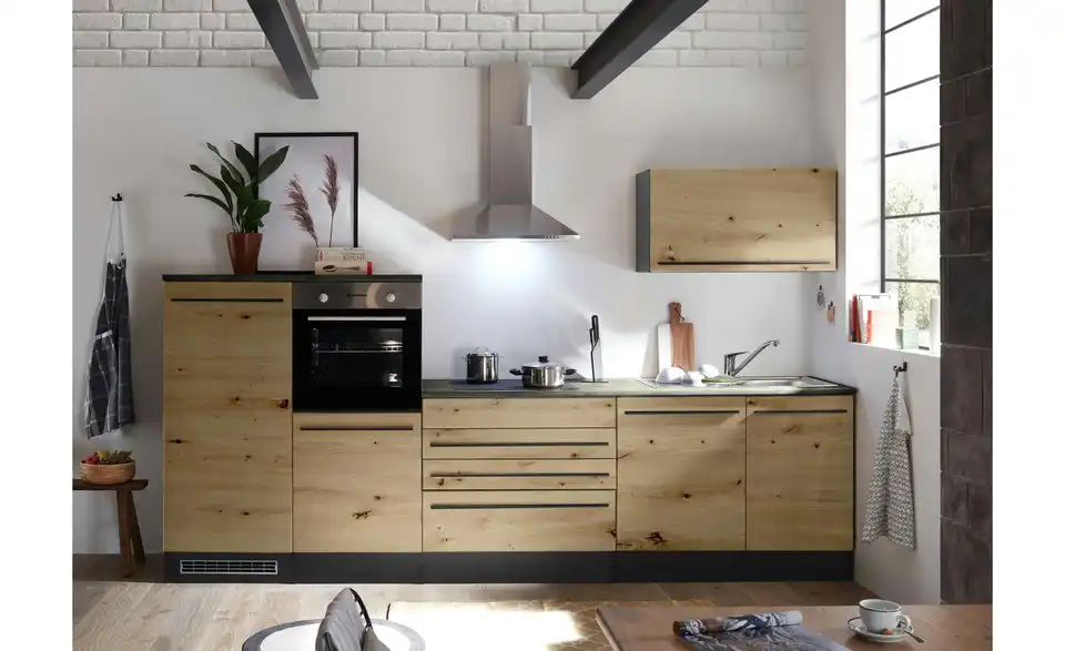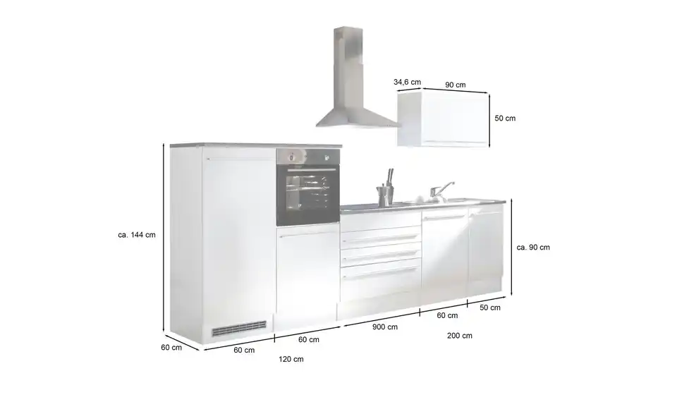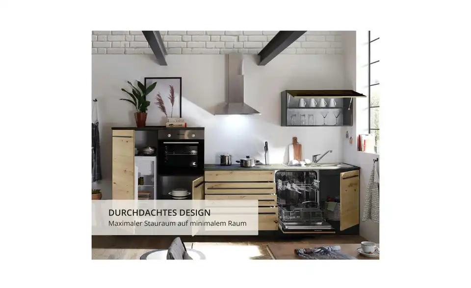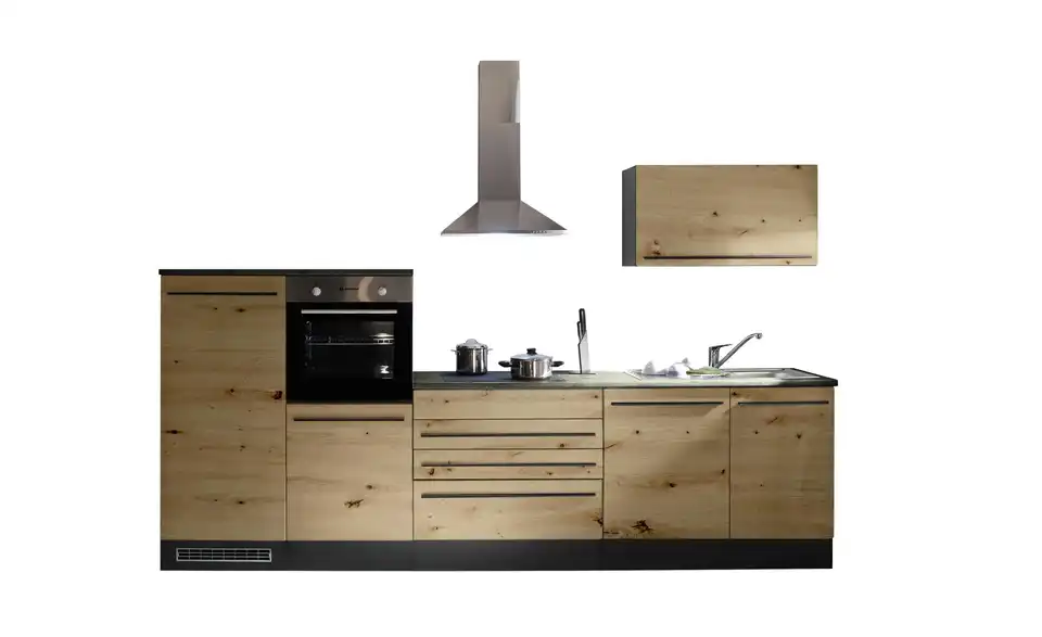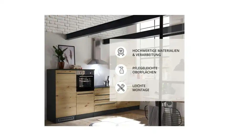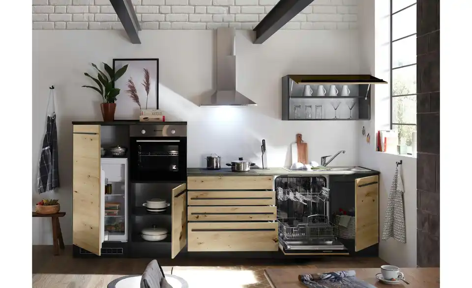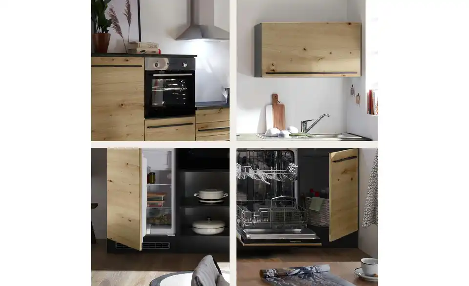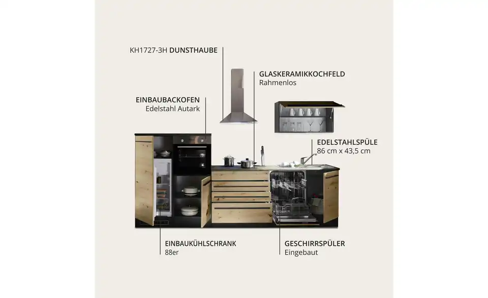 - Lieferumfang / mitgeliefertes ZubehörSpülenunterschrank, Geschirrspülerblende, Uunterschrank, Umbauschrank Backofen, Umbauschrank Kühlschrank, Hängeschrank, 2 Arbeitsplatten, Sockelleiste, Spüle, Einbaubackofen, Glaskeramikkochfeld, Dunstabzugshaube, Geschirrspüler, Einbaukühlschrank