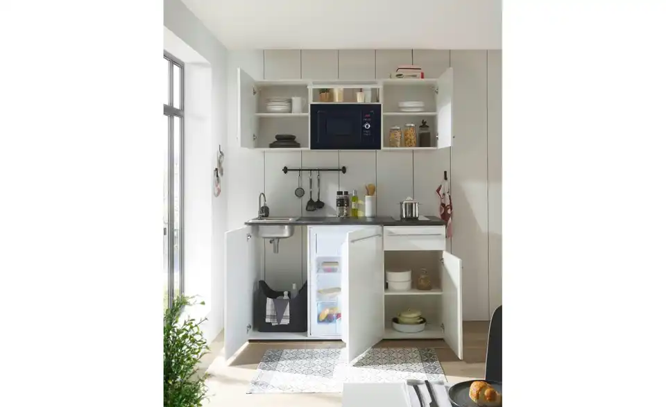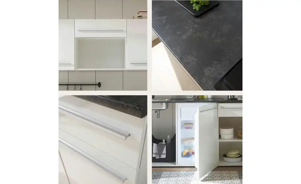 - Lieferumfang / mitgeliefertes Zubehör3 Hängeschränke, Spülenunterschrank, Kühlumbauschrank, Unterschrank, Arbeitsplatte, Spüle, Einbaukühlschrank, Glaskeramikkochfeld