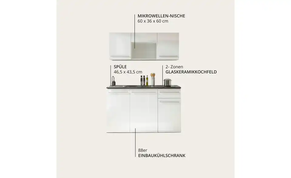- Bestehend aus3 Hängeschränke, Spülenunterschrank, Kühlumbauschrank, Unterschrank, Arbeitsplatte, Spüle, Einbaukühlschrank, Glaskeramikkochfeld