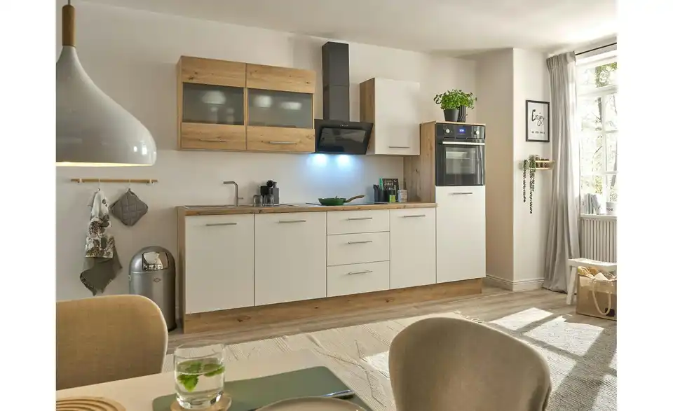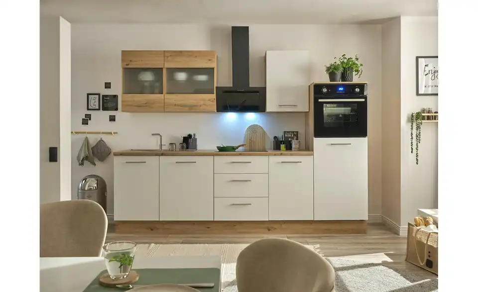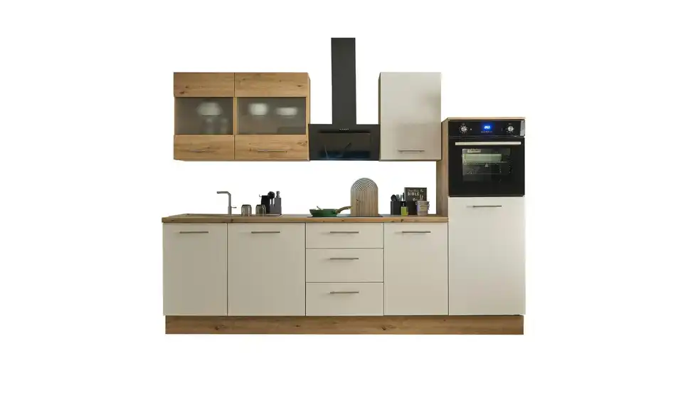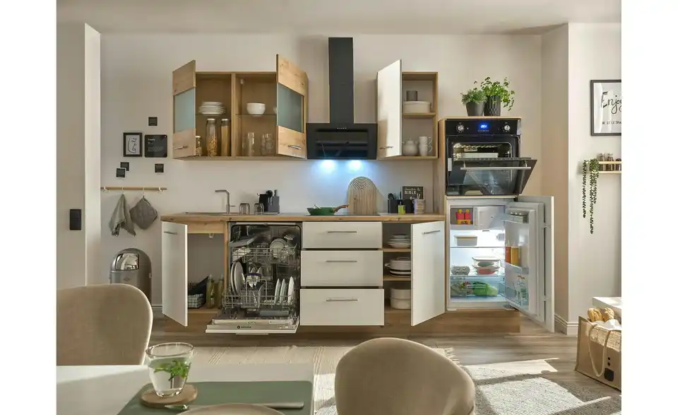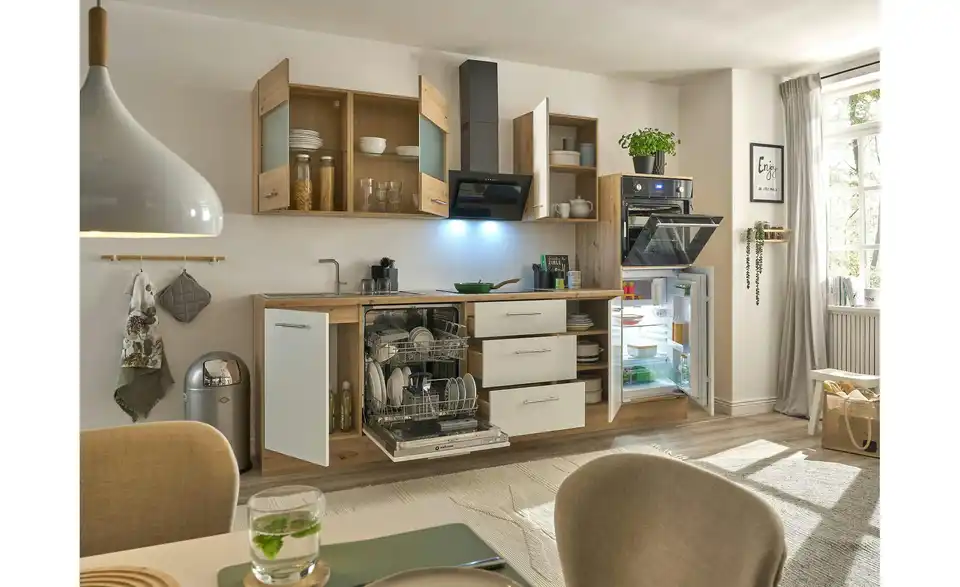 - Lieferumfang / mitgeliefertes ZubehörSpülenunterschrank, Geschirrspülerblende, Schubkastenschrank, Unterschrank, Geräteschrank, 2 Hängeschränke-Glas, Hängeschrank, Arbeitsplatte, Sockelleiste, Spüle, Einbaubackofen, Glaskeramikkochfeld, Dunstabzugshaube, Geschirrspüler, Einbaukühlschrank