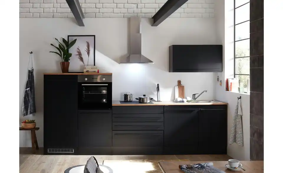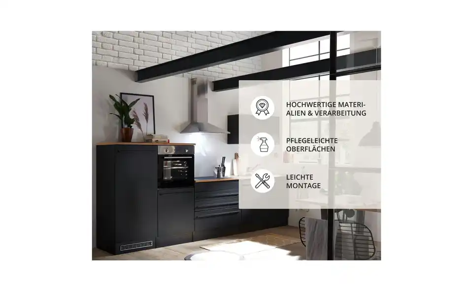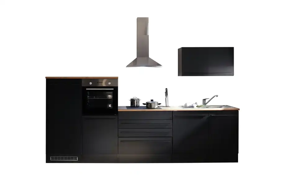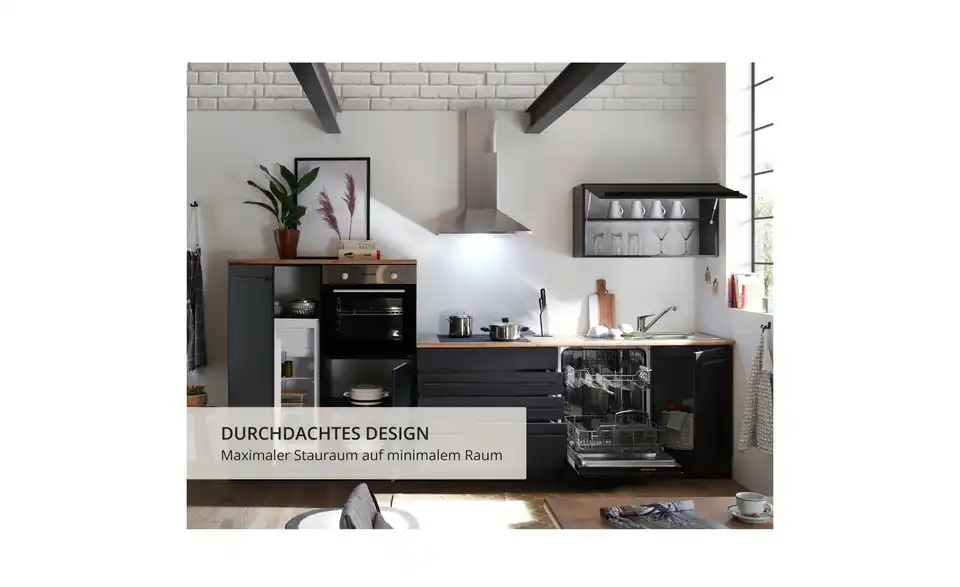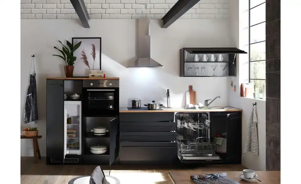 - Lieferumfang / mitgeliefertes ZubehörSpülenunterschrank, Geschirrspülerblende, Uunterschrank, Umbauschrank Backofen, Umbauschrank Kühlschrank, Hängeschrank, 2 Arbeitsplatten, Sockelleiste, Spüle, Einbaubackofen, Glaskeramikkochfeld, Dunstabzugshaube, Geschirrspüler, Einbaukühlschrank