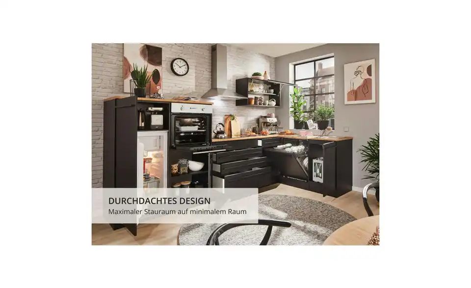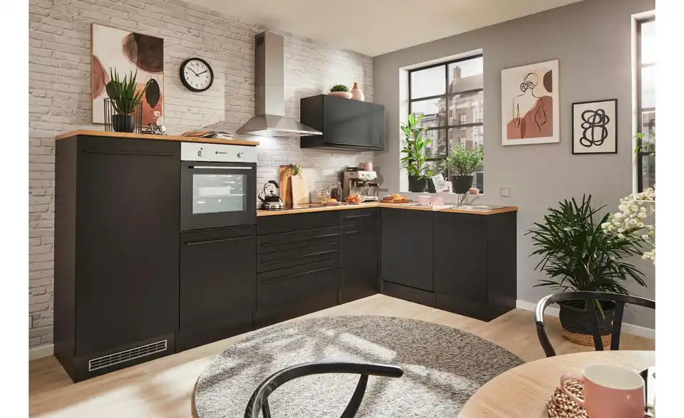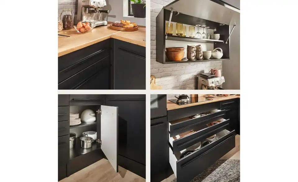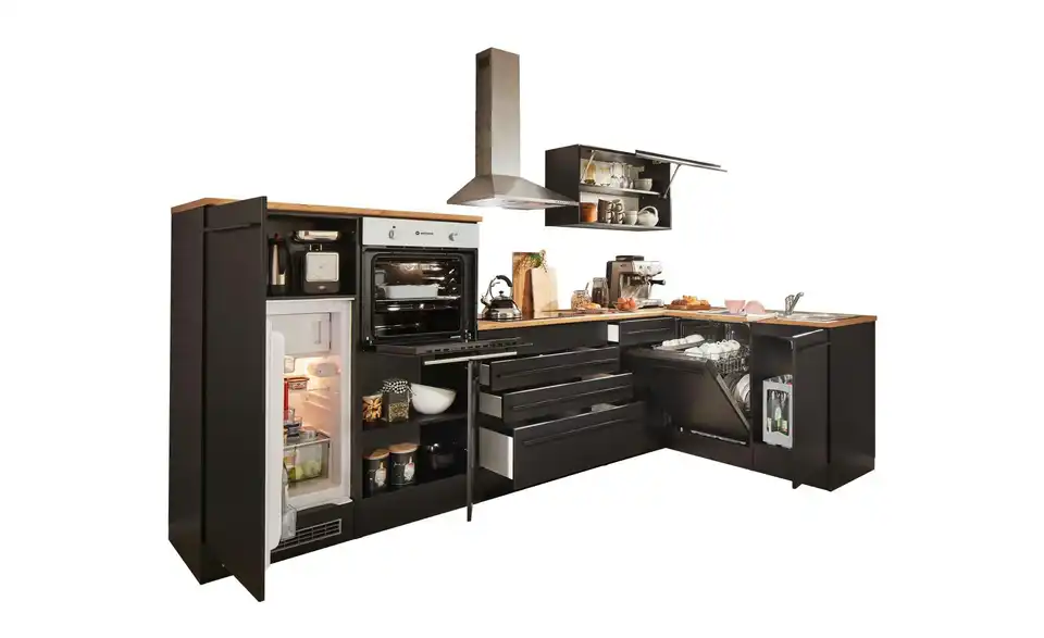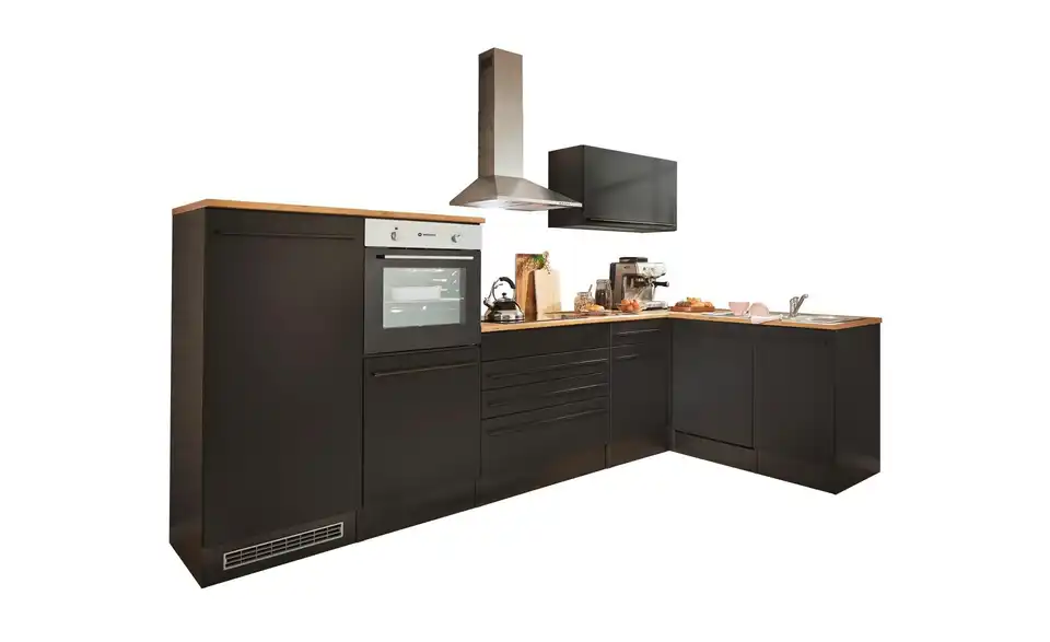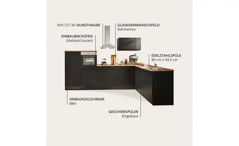 - Lieferumfang / mitgeliefertes ZubehörSpülenunterschrank, Geschirrspülerblende, Uunterschrank, Umbauschrank Backofen, Umbauschrank Kühlschrank, Hängeschrank, Eckumbauschrank , 3 Arbeitsplatten, Sockelleiste, Spüle, Einbaubackofen, Glaskeramikkochfeld, Dunstabzugshaube, Geschirrspüler, Einbaukühlschrank