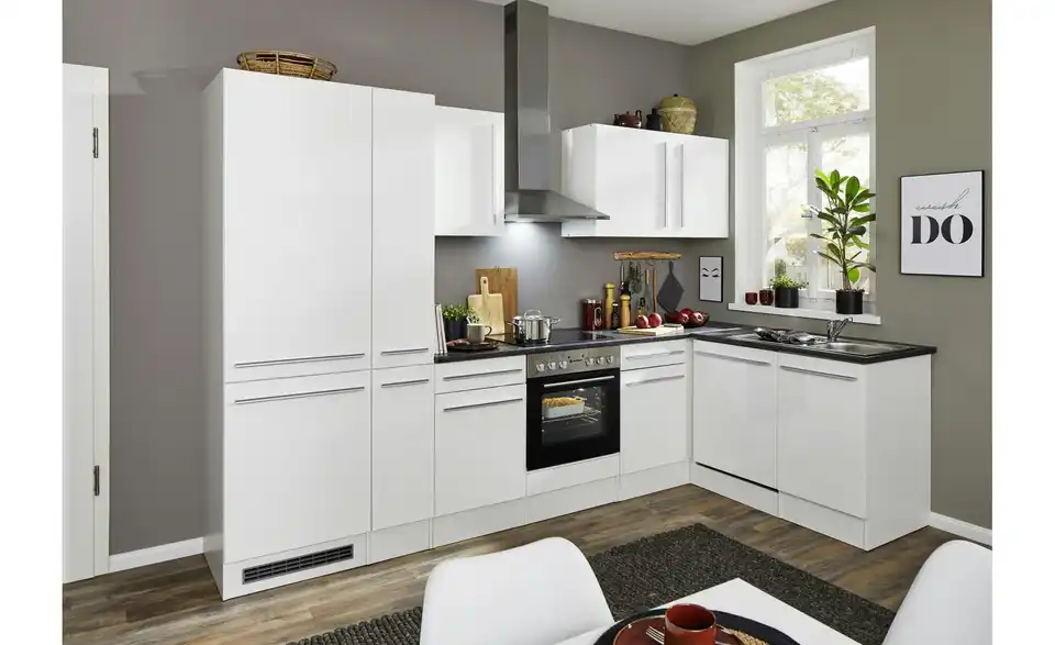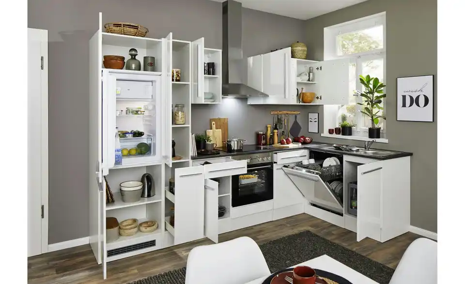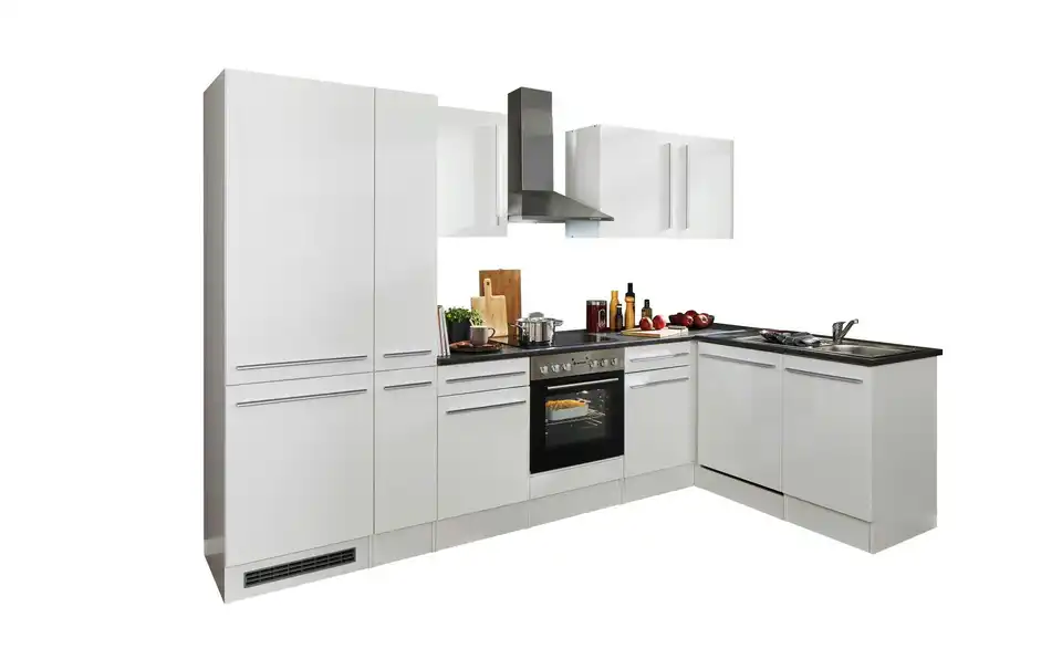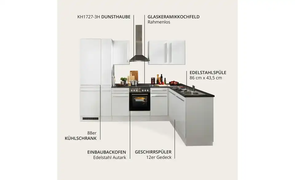 - Lieferumfang / mitgeliefertes ZubehörUnterschrank, Herdschrank, Tür für Geschirrspülerblende, Spülenunterschrank,Kühlumbauschrank,Vorratsschrank, 3 Hängeschränke, 2 Arbeitsplatten, Eckschrank, Spüle, Dunstabzugshaube, Einbauherdset, Geschirrspüler, Einbaukühlschrank