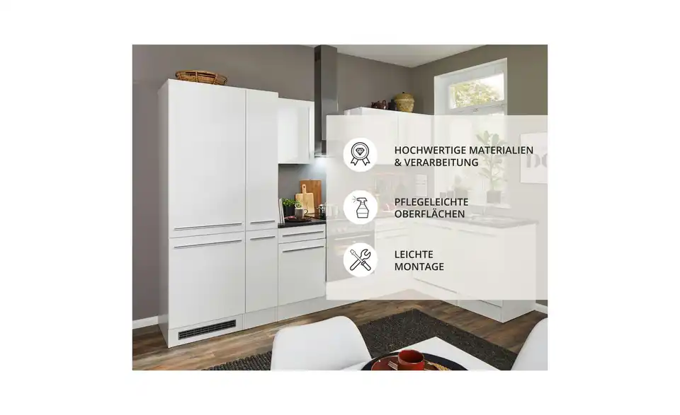 - Mehr zu Ausstattung / FunktionMelaminbeschichtung,Kühlumbauschrank mit Lüftungsgitter, Unterflurauszug, höhenverstellbare Kunststofffüße, Arbeitsplatte ohne Auschnitte - dadurch Schränke zum Teil variabel stellbar, ohne Armatur