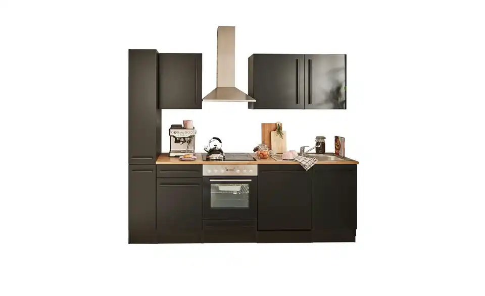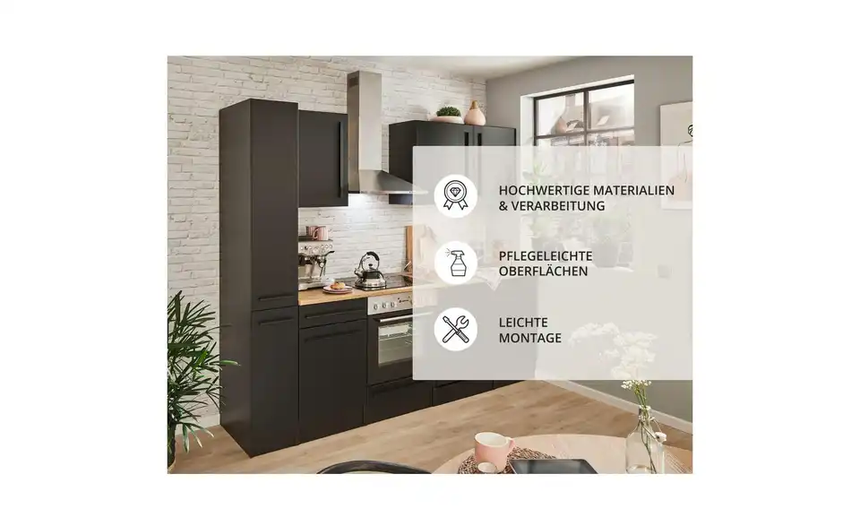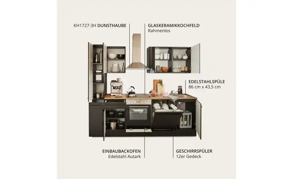- Bestehend ausUnterschrank, Herdschrank, Tür für Geschirrspülerblende, Spülenunterschrank,Vorratsschrank, 3 Hängeschränke, 1 Arbeitsplatte, Spüle, Dunstabzugshaube, Einbauherdset, Geschirrspüler