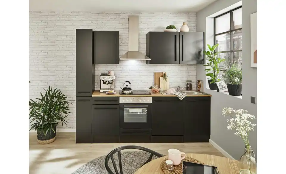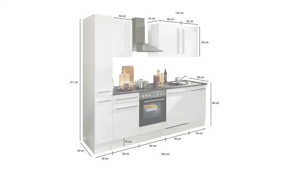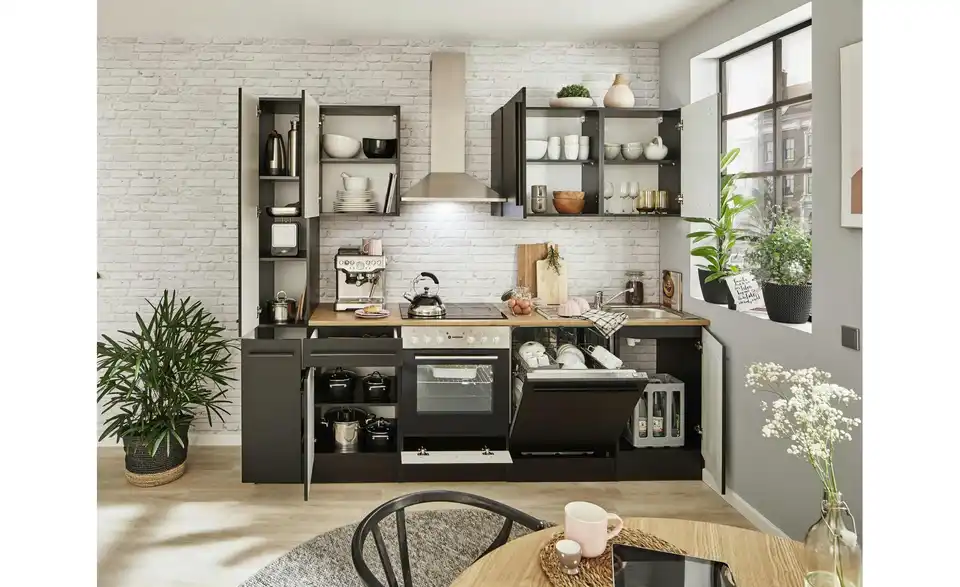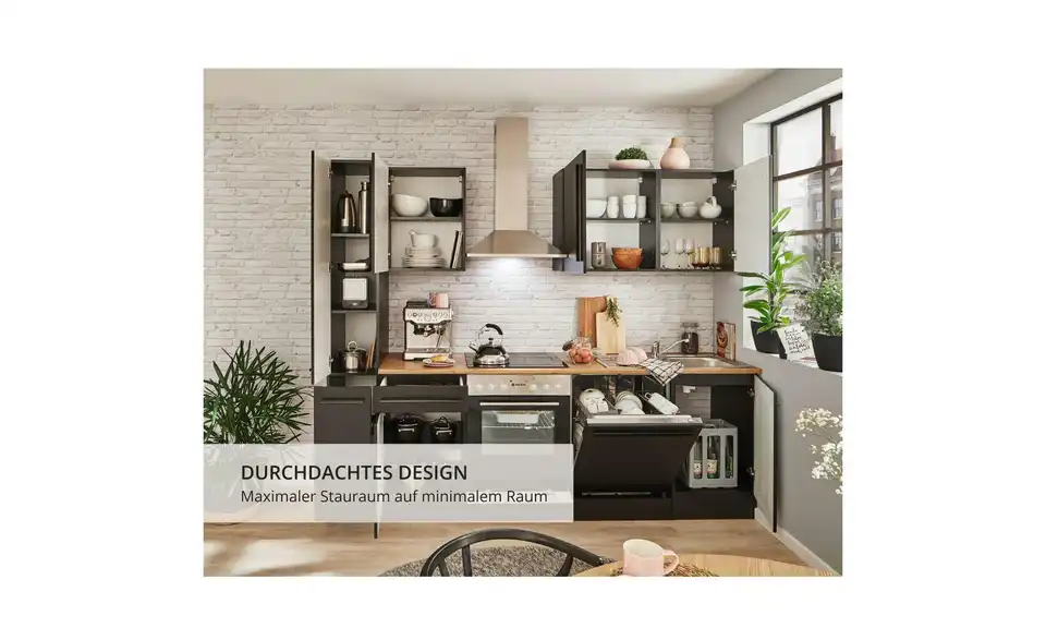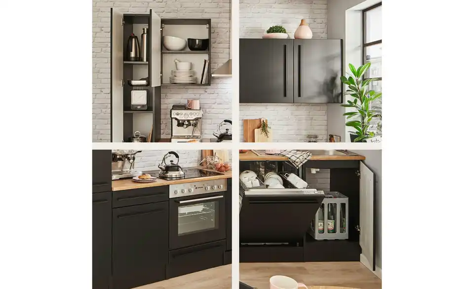 - Lieferumfang / mitgeliefertes ZubehörUnterschrank, Herdschrank, Tür für Geschirrspülerblende, Spülenunterschrank,Vorratsschrank, 3 Hängeschränke, 1 Arbeitsplatte, Spüle, Dunstabzugshaube, Einbauherdset, Geschirrspüler