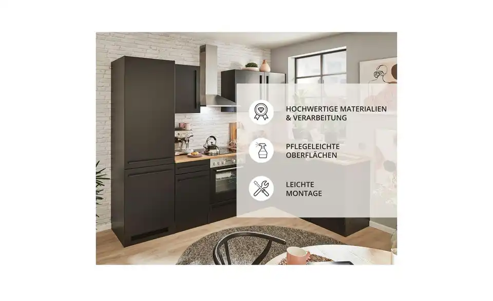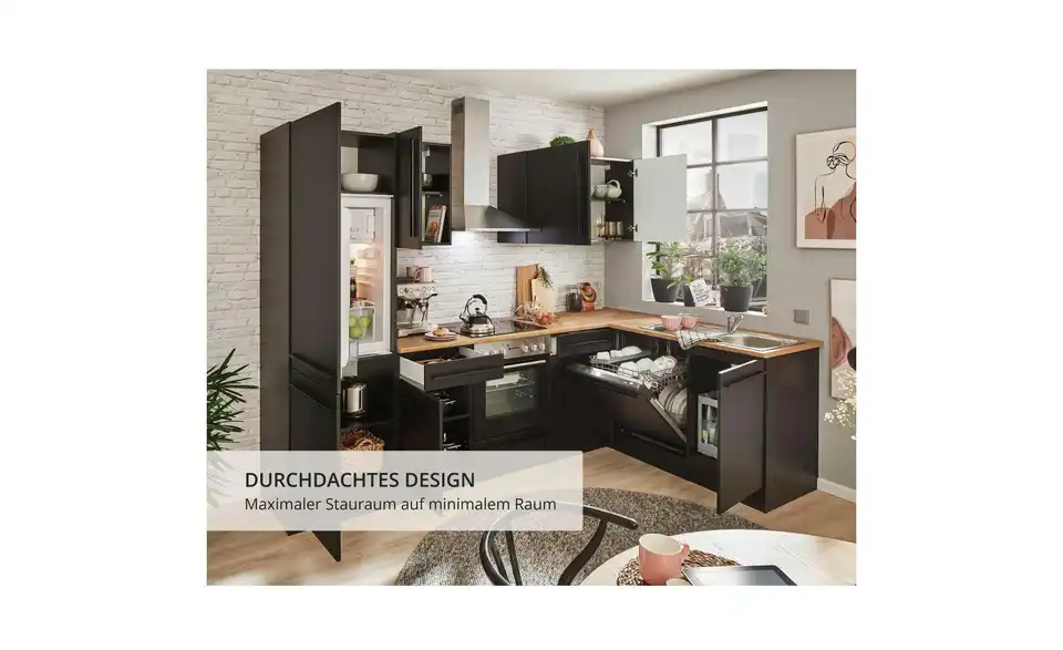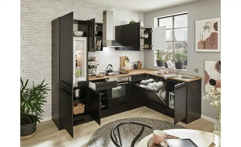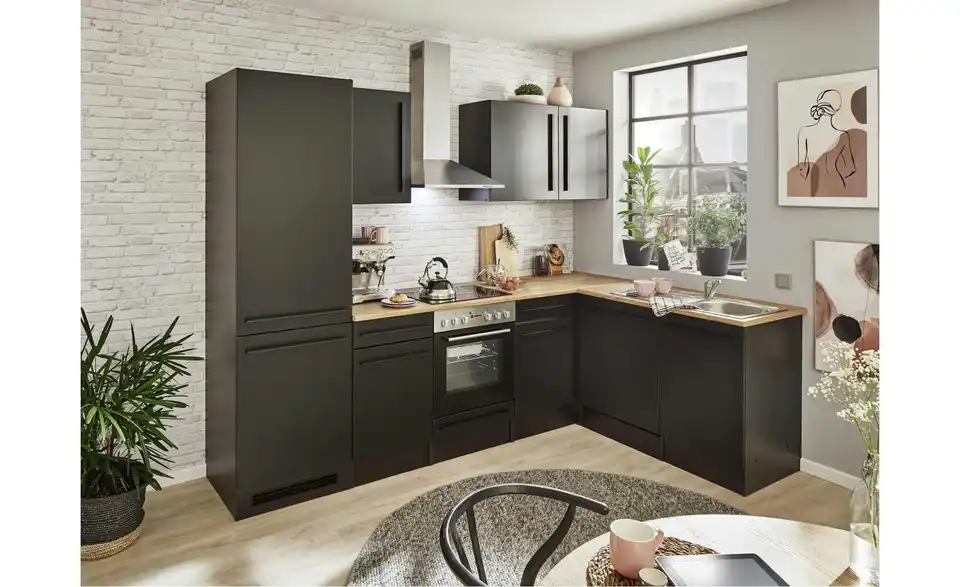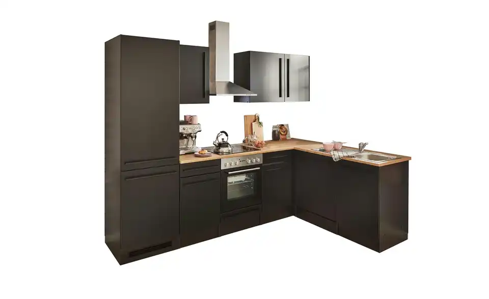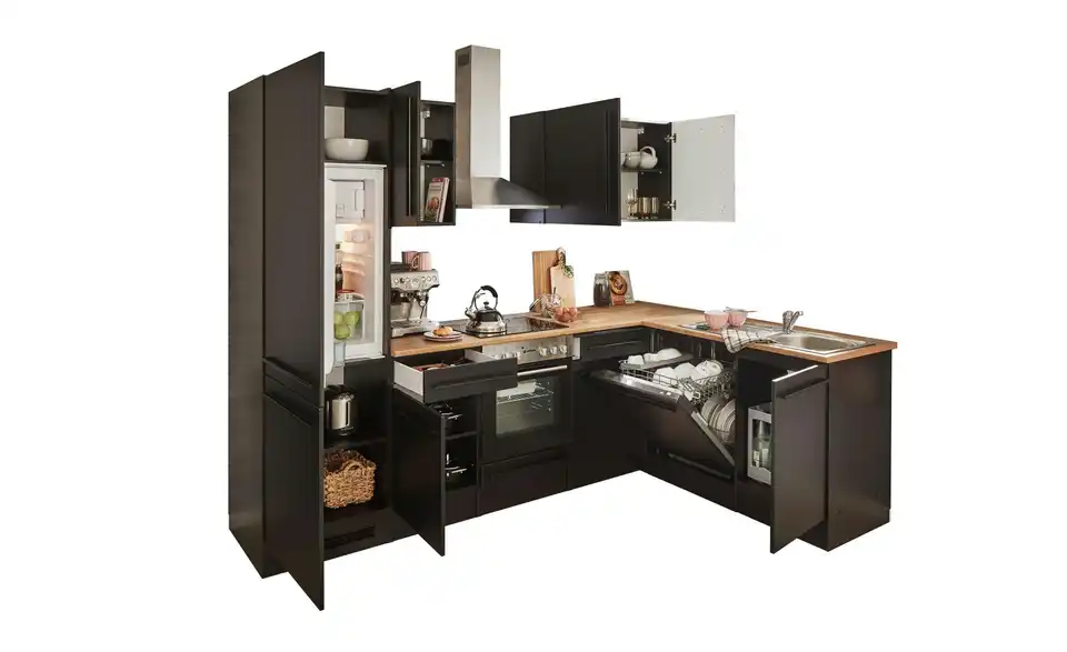 - Lieferumfang / mitgeliefertes ZubehörUnterschrank, Herdschrank, Tür für Geschirrspülerblende, Spülenunterschrank,Kühlumbauschrank, 3 Hängeschränke, 2 Arbeitsplatten, Eckschrank, Spüle, Dunstabzugshaube, Einbauherdset, Geschirrspüler, Einbaukühlschrank