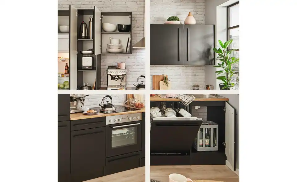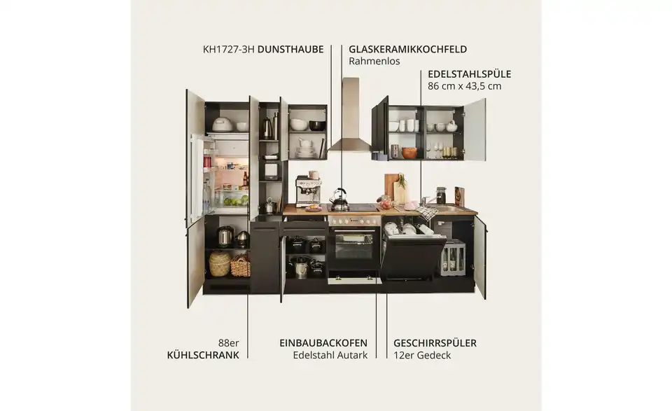 - Bestehend ausUnterschrank, Herdschrank, Tür für Geschirrspülerblende, Spülenunterschrank,Kühlumbauschrank,Vorratsschrank, 3 Hängeschränke, 1 Arbeitsplatte, Spüle, Dunstabzugshaube, Einbauherdset, Geschirrspüler, Einbaukühlschrank