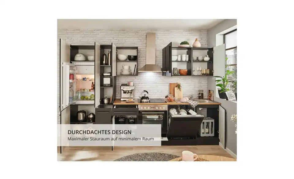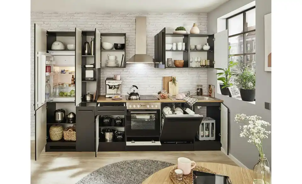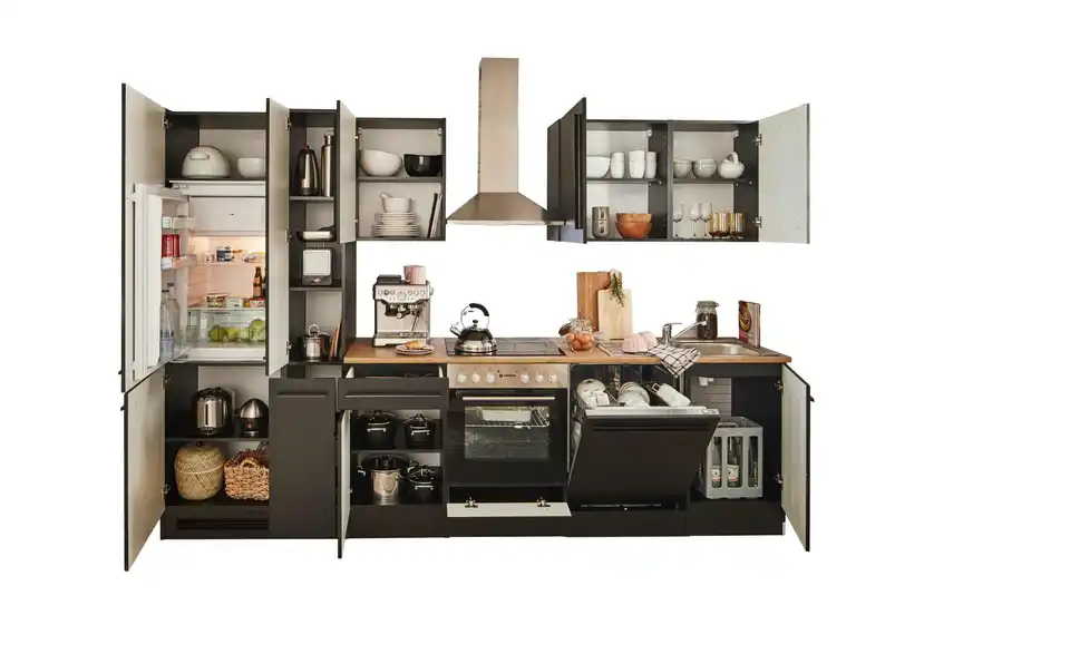 - Lieferumfang / mitgeliefertes ZubehörUnterschrank, Herdschrank, Tür für Geschirrspülerblende, Spülenunterschrank,Kühlumbauschrank,Vorratsschrank, 3 Hängeschränke, 1 Arbeitsplatte, Spüle, Dunstabzugshaube, Einbauherdset, Geschirrspüler, Einbaukühlschrank