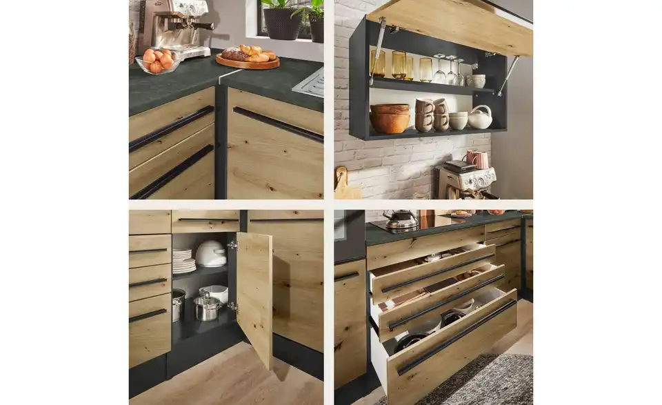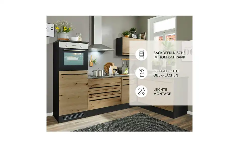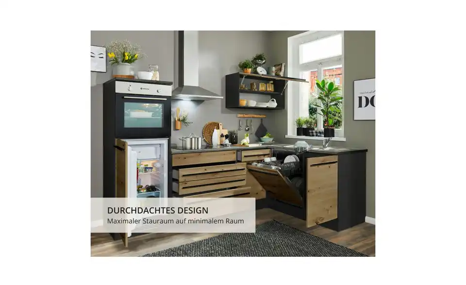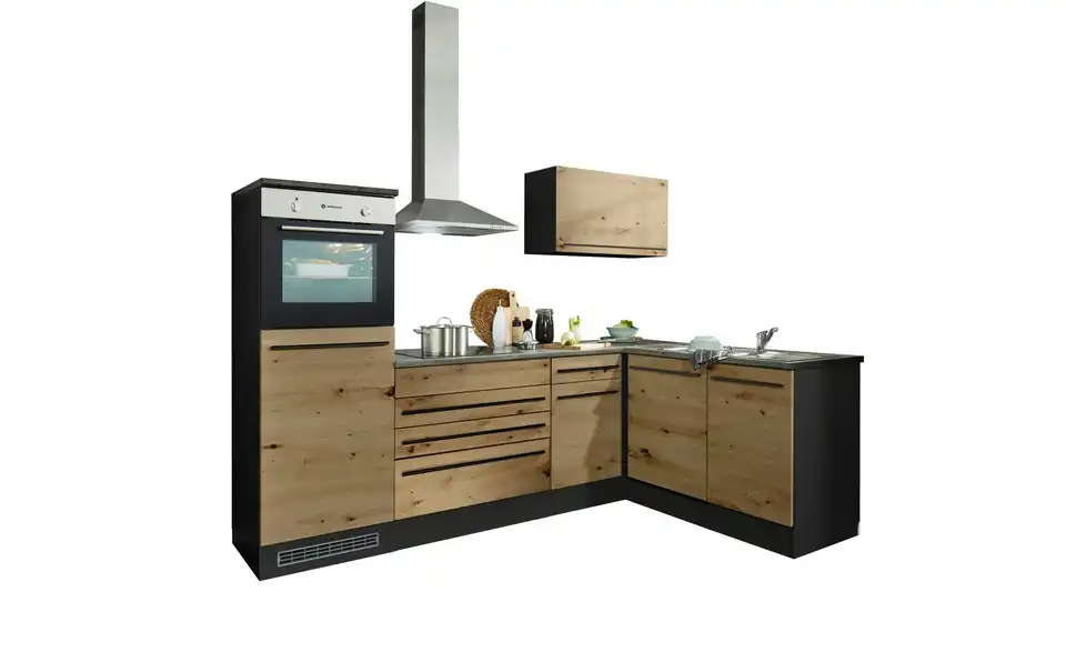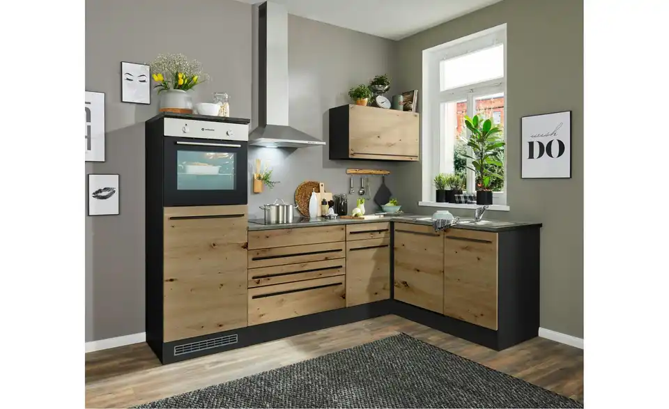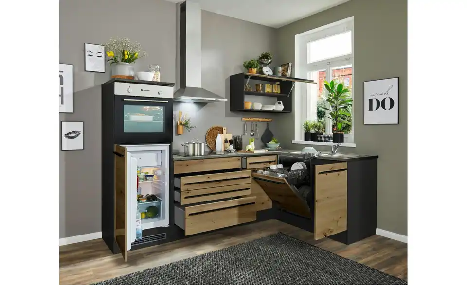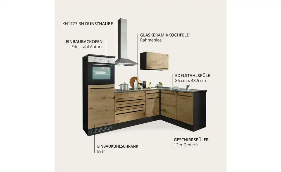 - Lieferumfang / mitgeliefertes ZubehörSpülenunterschrank, Unterschrank, Hängeschrank, Geschirrspülerblende, Hochschrank,Eckunterschrank, Arbeitsplatte Ecke, Arbeitsplatte, Sockelleiste, Einbaubackofen, Glaskeramikkochfeld, Dunstabzugshaube, Geschirrspüler, Einbaukühlschrank