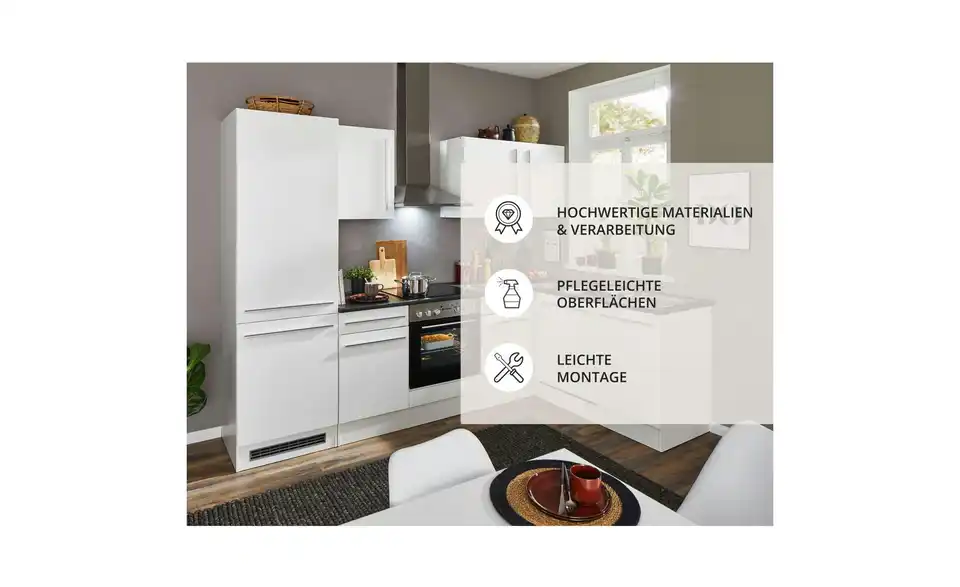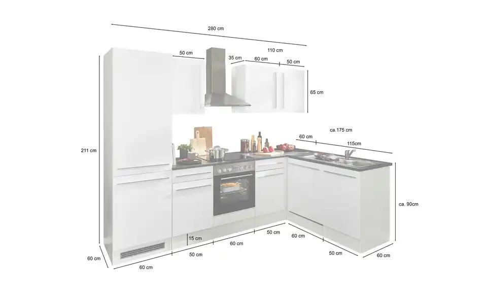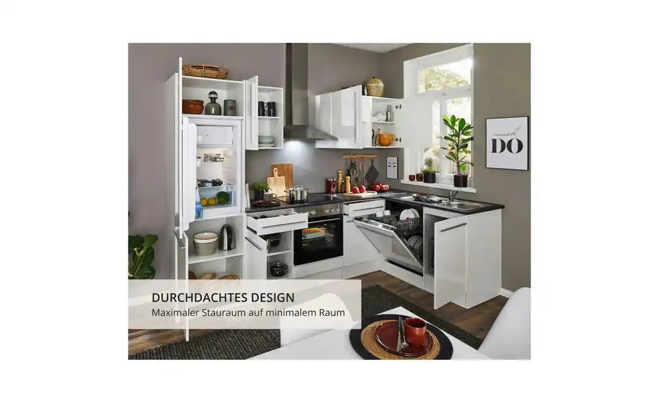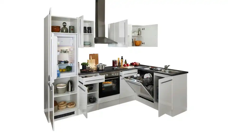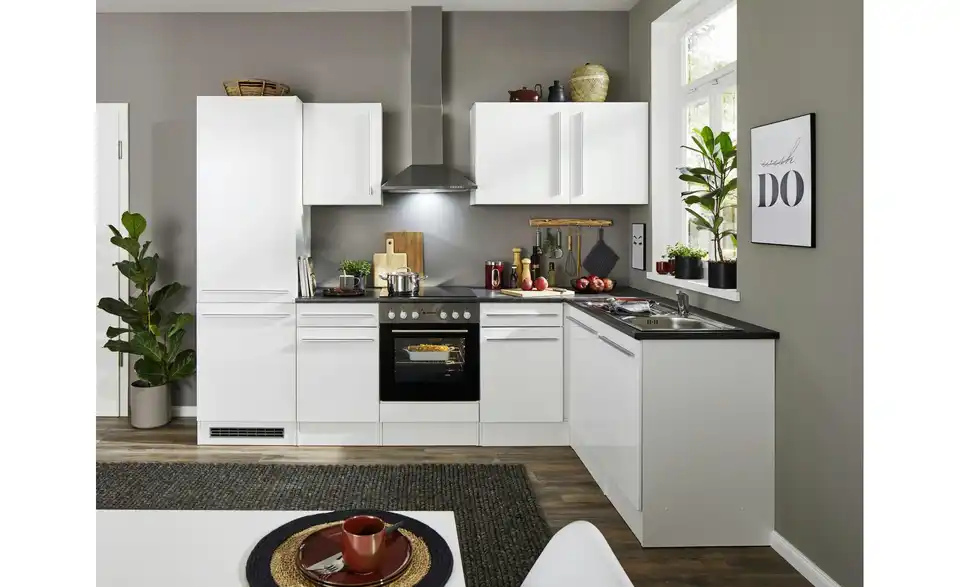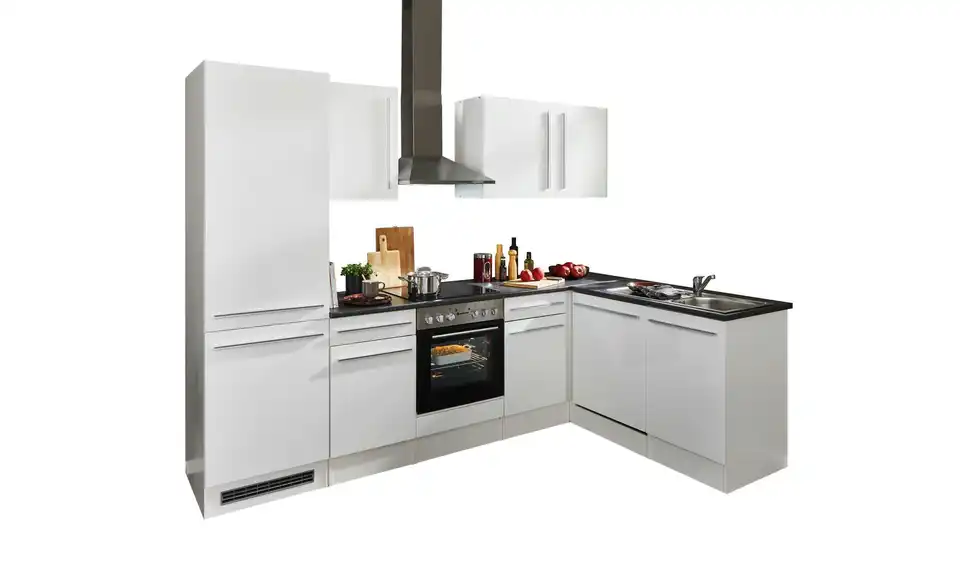 - Lieferumfang / mitgeliefertes ZubehörUnterschrank, Herdschrank, Tür für Geschirrspülerblende, Spülenunterschrank,Kühlumbauschrank, 3 Hängeschränke, 2 Arbeitsplatten, Eckschrank, Spüle, Dunstabzugshaube, Einbauherdset, Geschirrspüler, Einbaukühlschrank