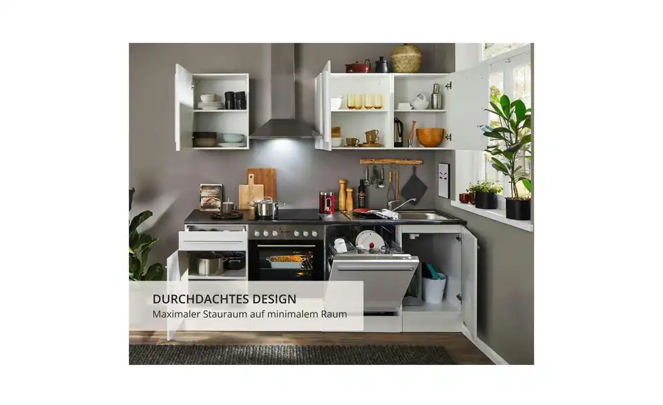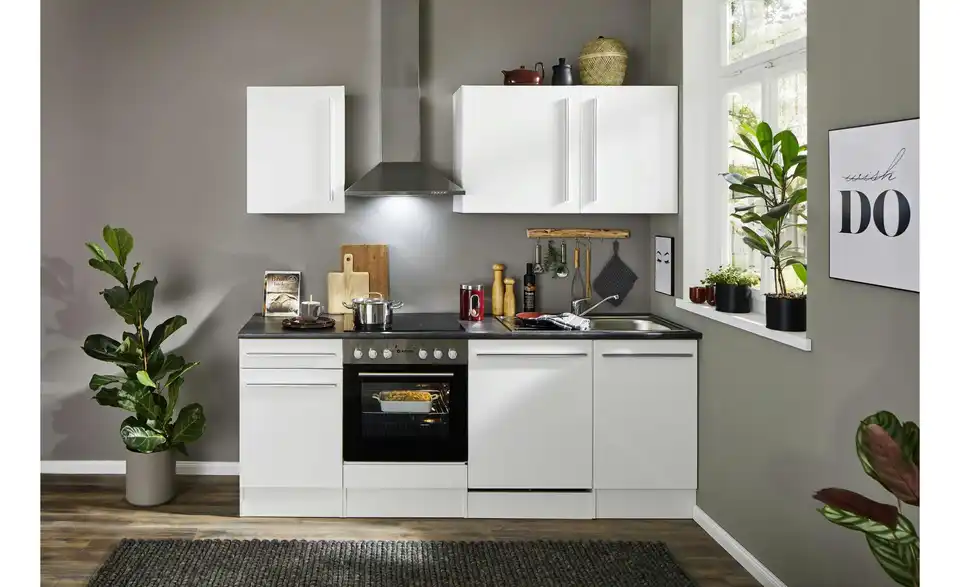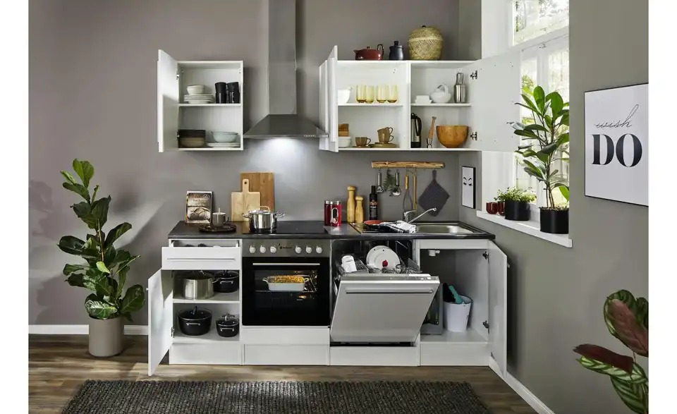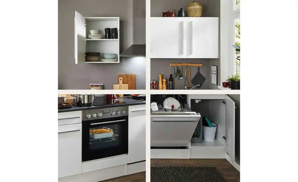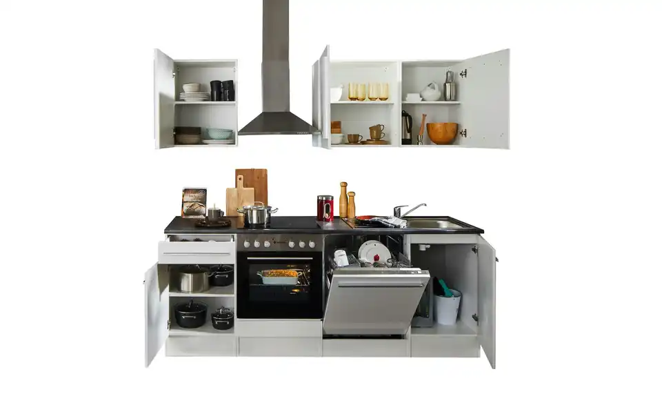 - Lieferumfang / mitgeliefertes ZubehörUnterschrank, Herdschrank, Tür für Geschirrspülerblende, Spülenunterschrank, 3 Hängeschränke, 1 Arbeitsplatte, Spüle, Dunstabzugshaube, Einbauherdset, Geschirrspüler
