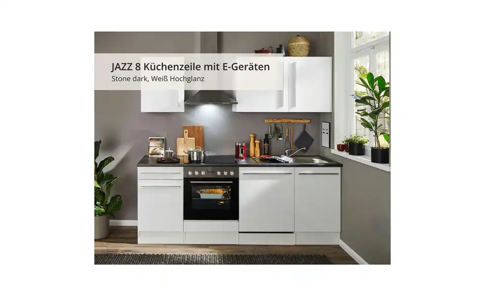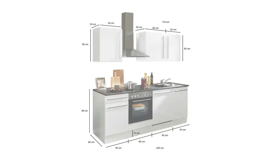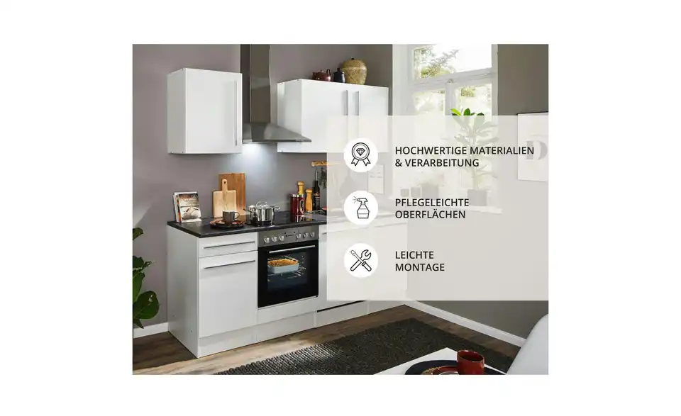 - Bestehend ausUnterschrank, Herdschrank, Tür für Geschirrspülerblende, Spülenunterschrank, 3 Hängeschränke, 1 Arbeitsplatte, Spüle, Dunstabzugshaube, Einbauherdset, Geschirrspüler
